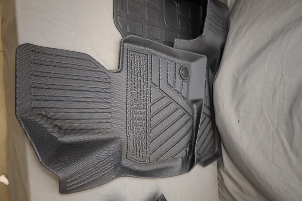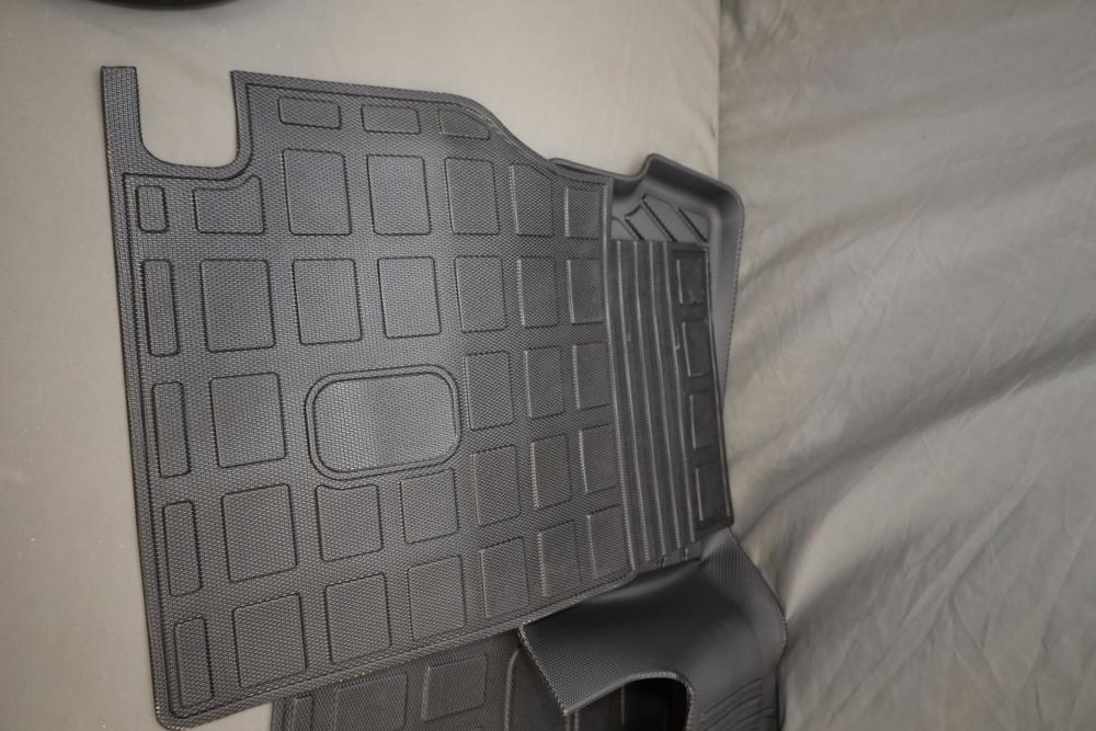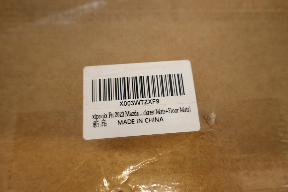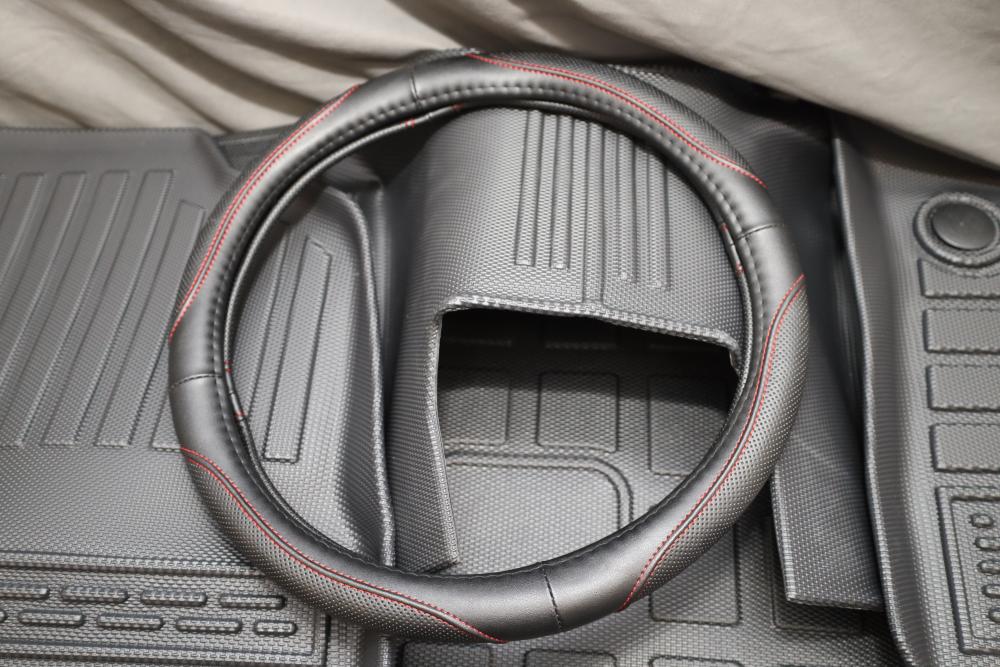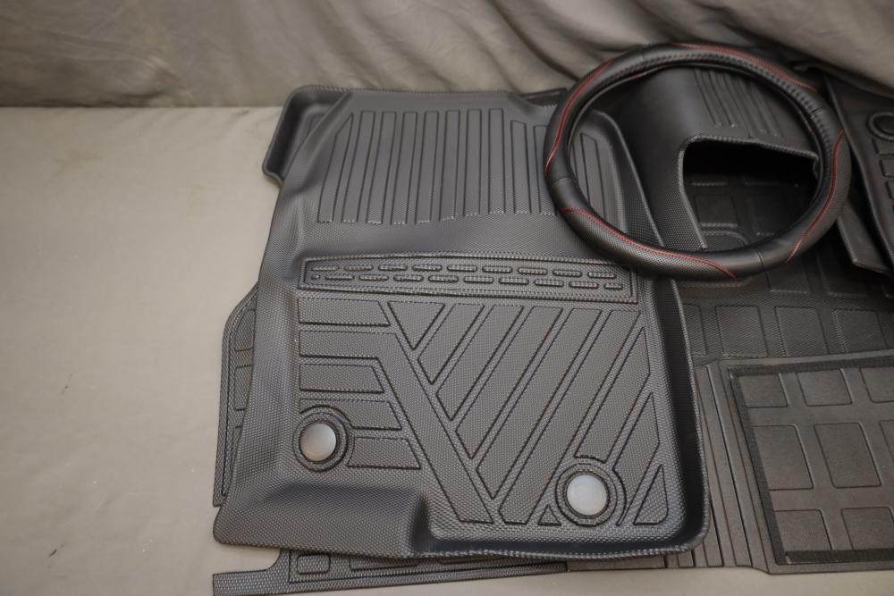 Various all season floor mats for 2023 Mazda, also incl black steering wheel with red stitching. Appearing to be new.
