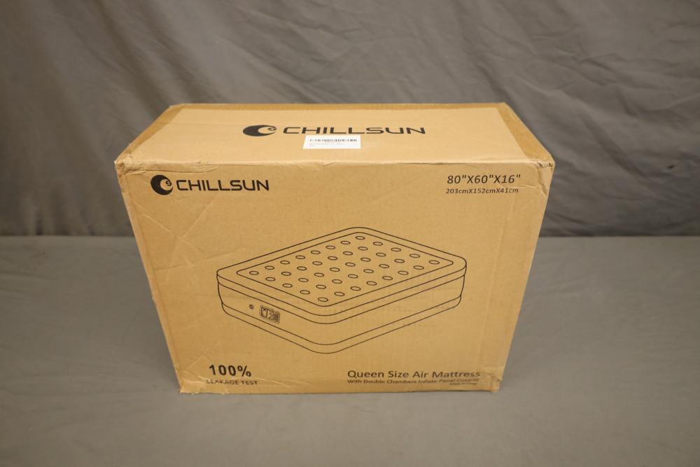 Chillsun queen size air mattress 80" X 60" X 16". Appearing to be new in original box.