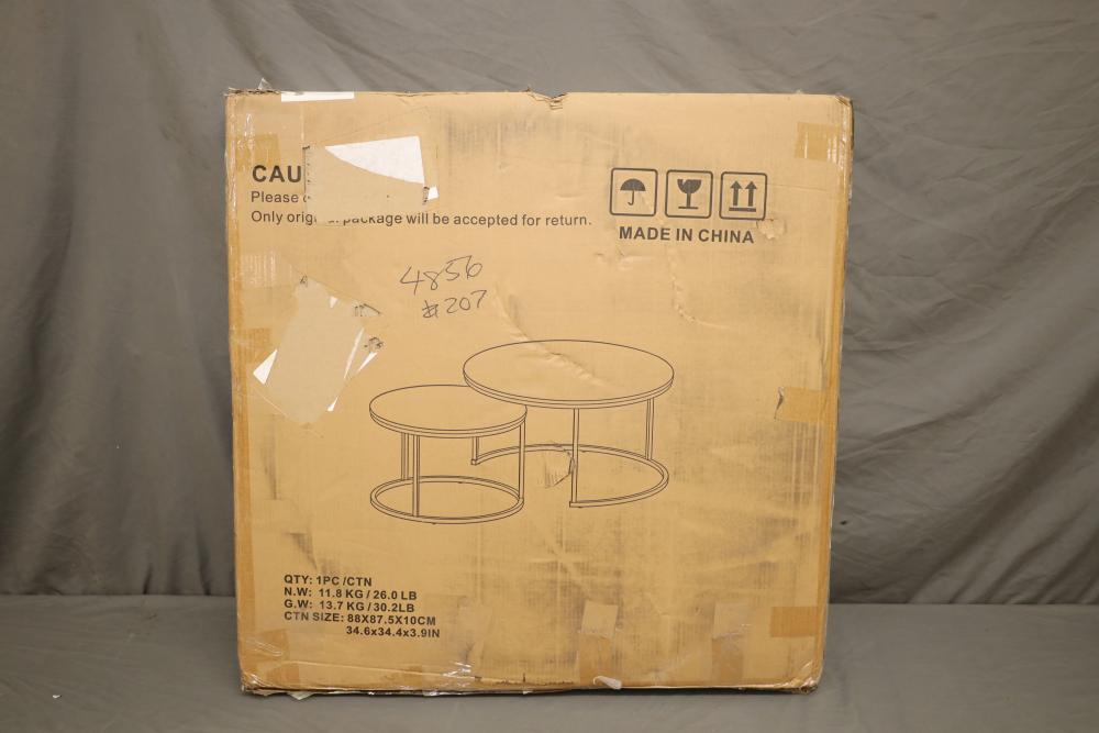 White nesting coffee tables marble pattern 31.5" dia. Appearing to be new in original box.