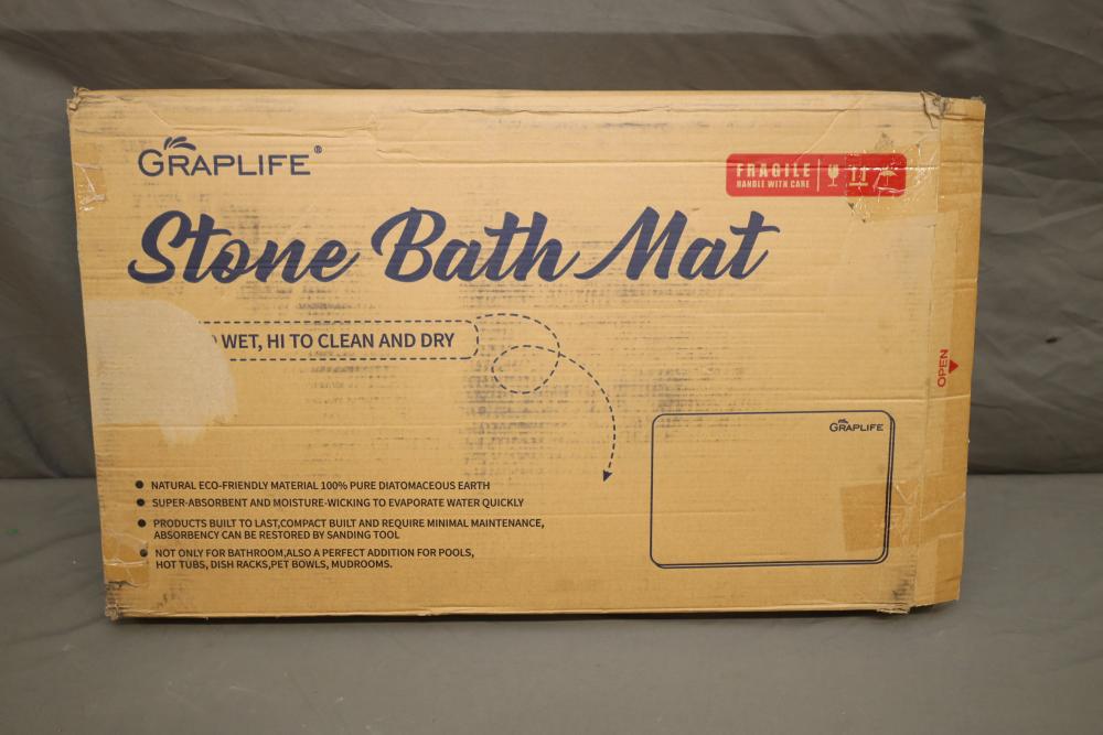 Graplife stone bath mat, white in color 23.5" X 15". Appearing to be new in original box.