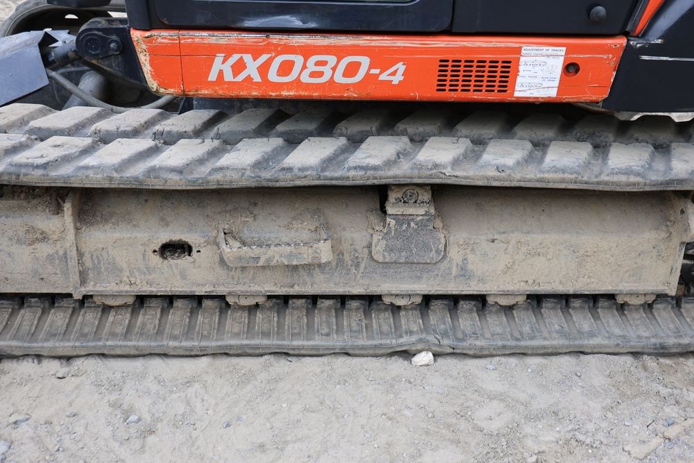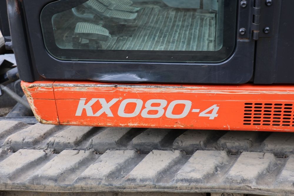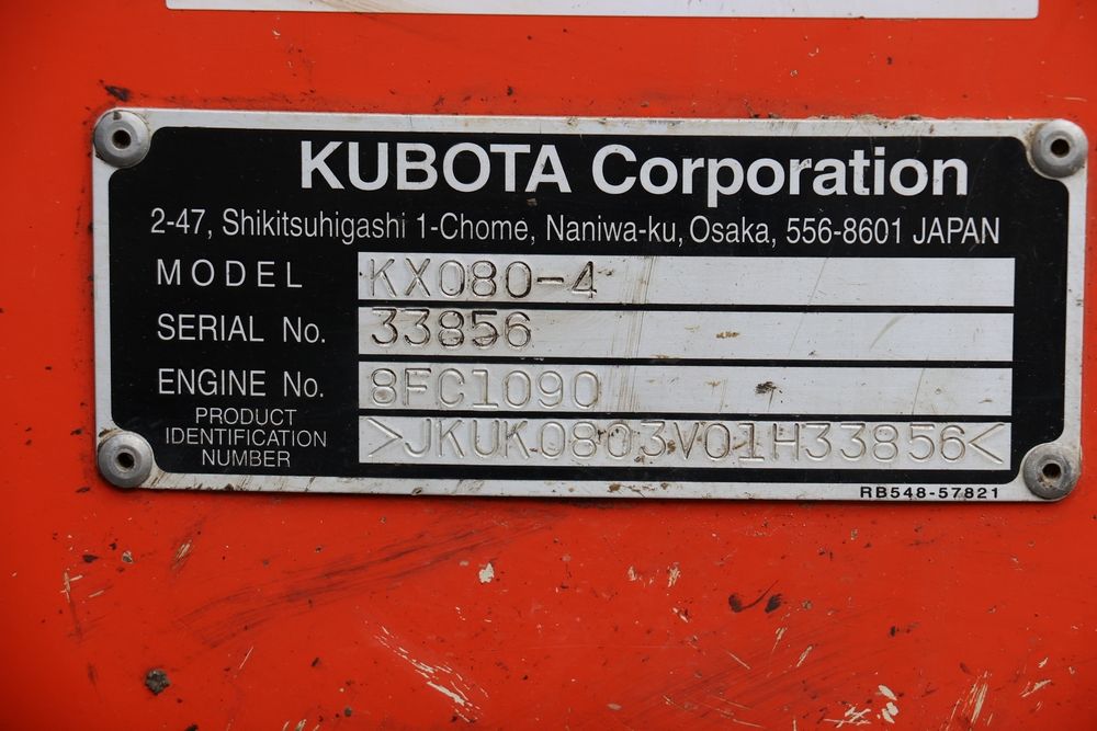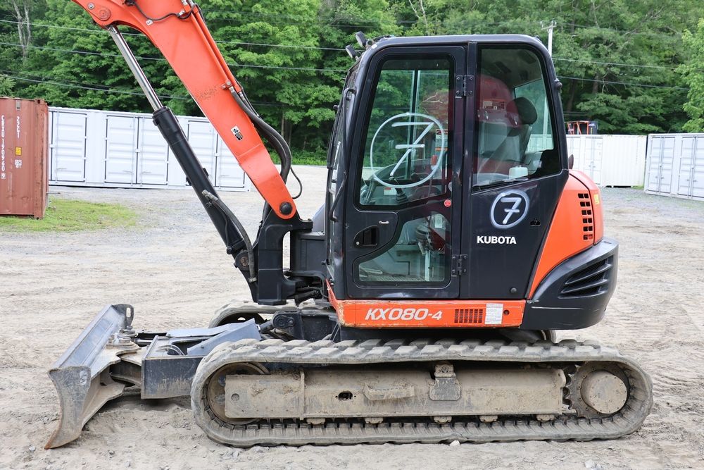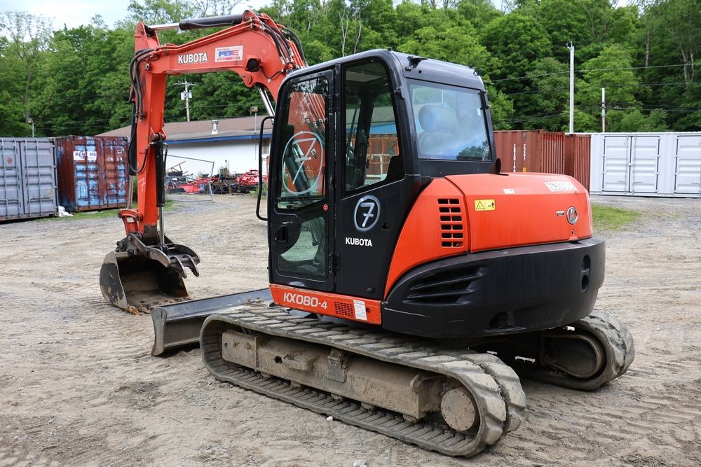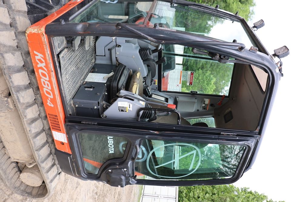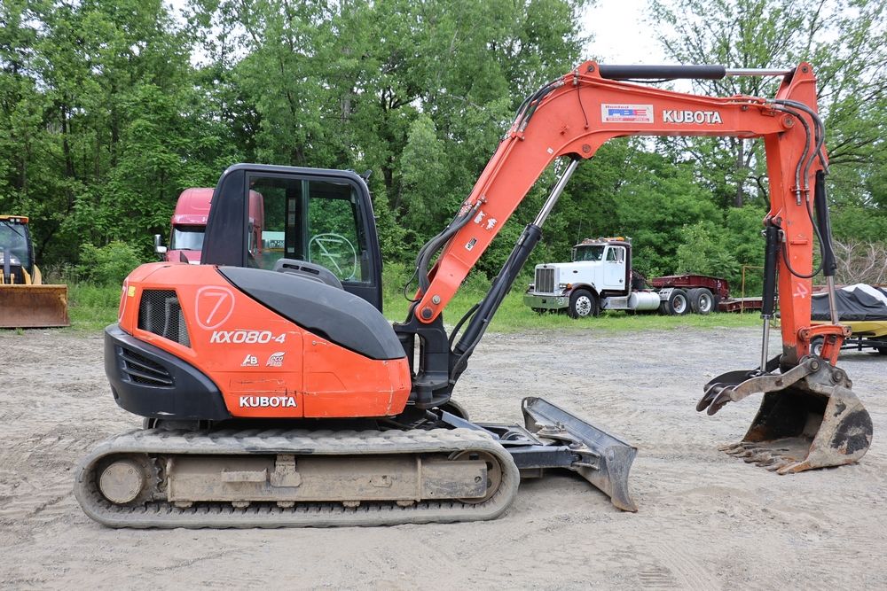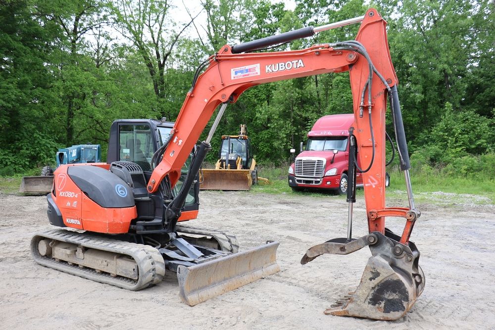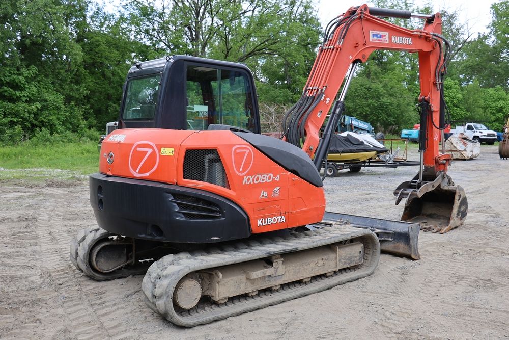 2015 Kubota KX080-4 excavator PIN: JKUK0803V01H33856, S/N 33835, engine model V3307-CR-T- EF06, engine number 8FC1090, with 36" and 24" buckets, hydraulic thumb and flat angle blade. Hour meter reading 6400. Runs, drives, and in good operating condition.
