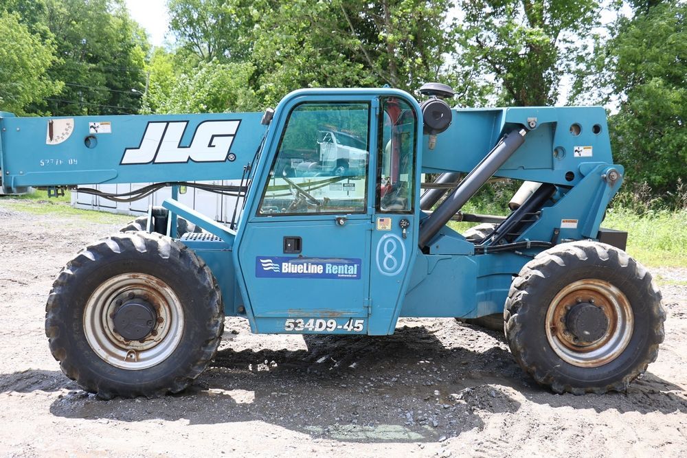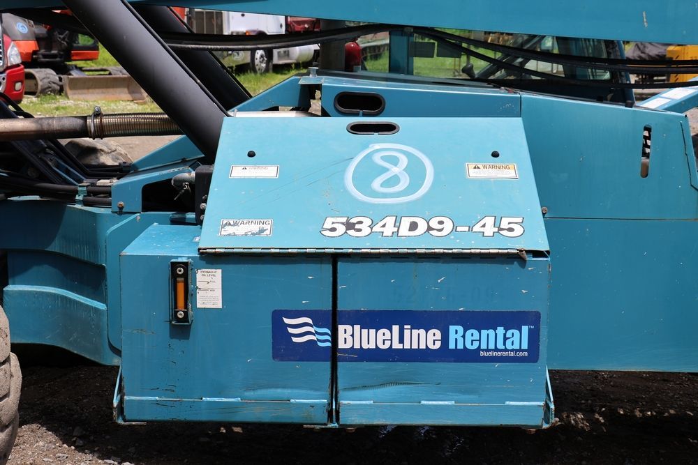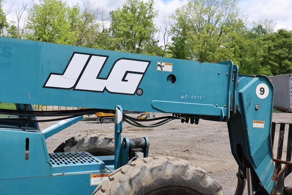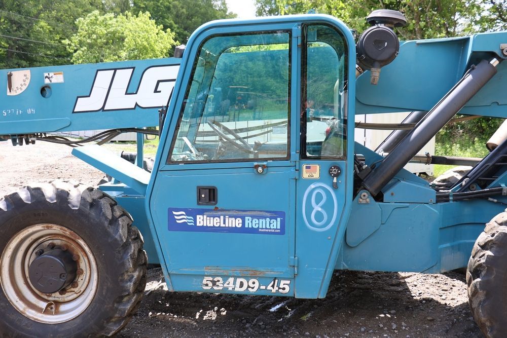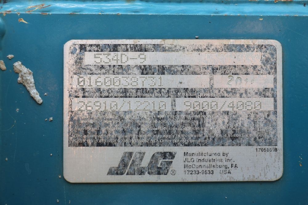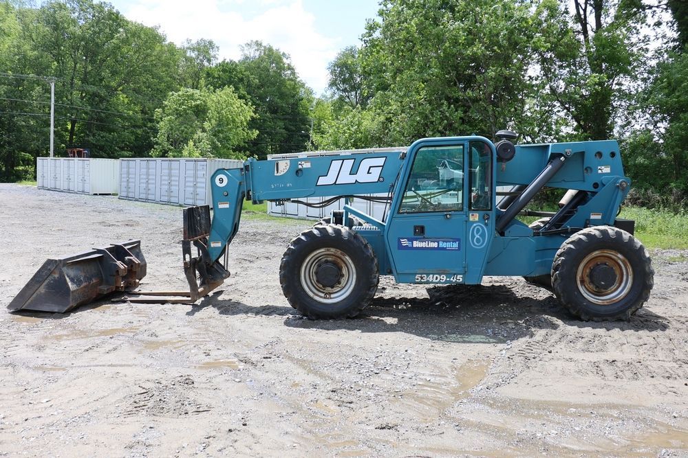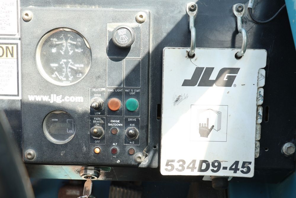 2011 JLG model 534D9-45 telescopic forklift with a 4.5L 110 Gross rated HP engine model QSB4.5, enclosed cab and hand foot controls, quick disconnect, bucket attachment, forks, Auxiliary hydraulic controls, max weight 36,000 Lb. Hour meter reading 4333. Runs, drives, and in good operating condition.