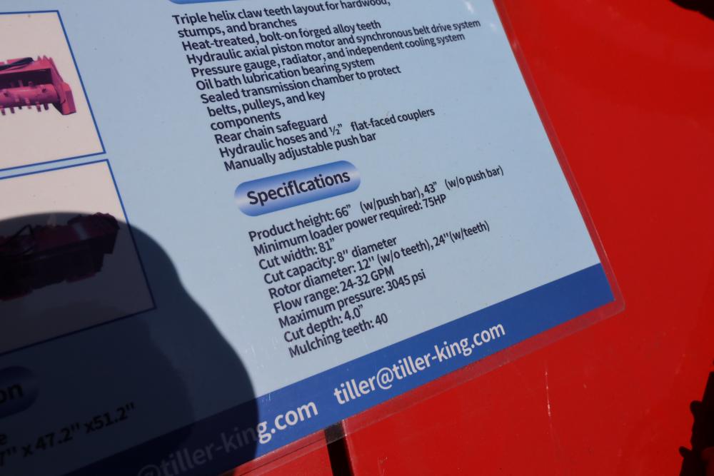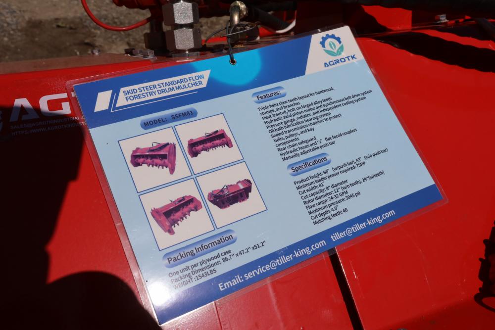 New 2024 TOPCAT Skid Steer Standard Flow Forestry Drum Mulcher model SSFM81, to fit 100 hp skid steer, double carbine teeth, C550 hyd motor, 45 gpm, 4000 PSI. Serial Number SSFM8124022101A.