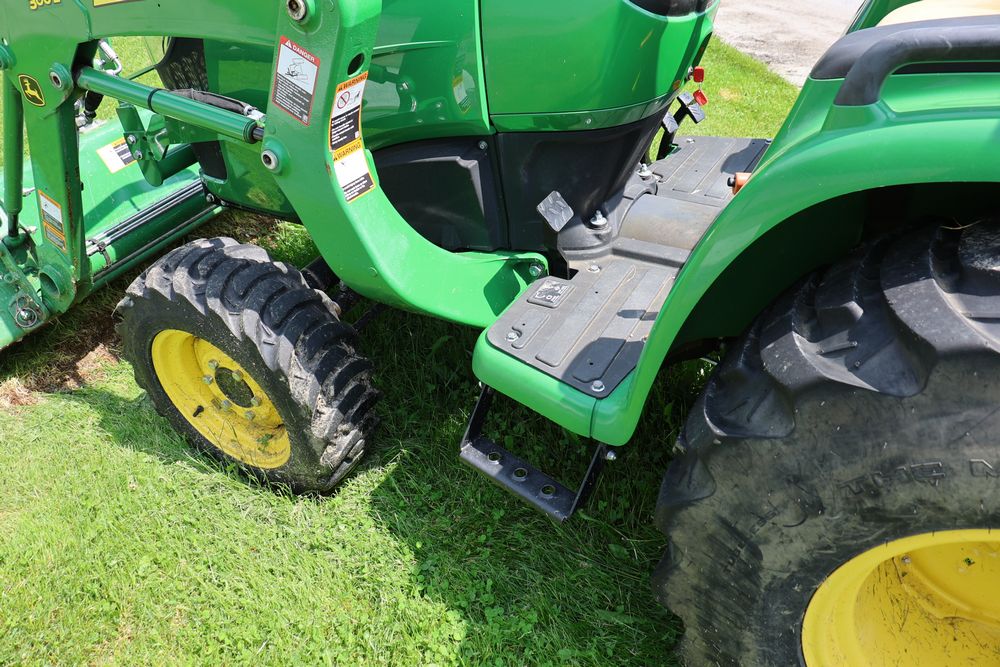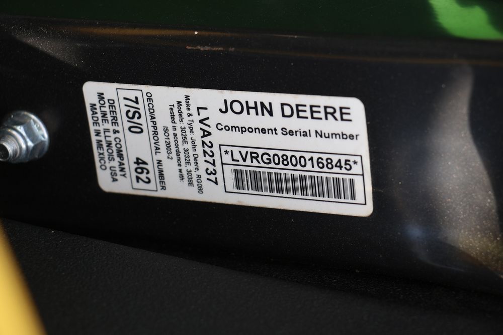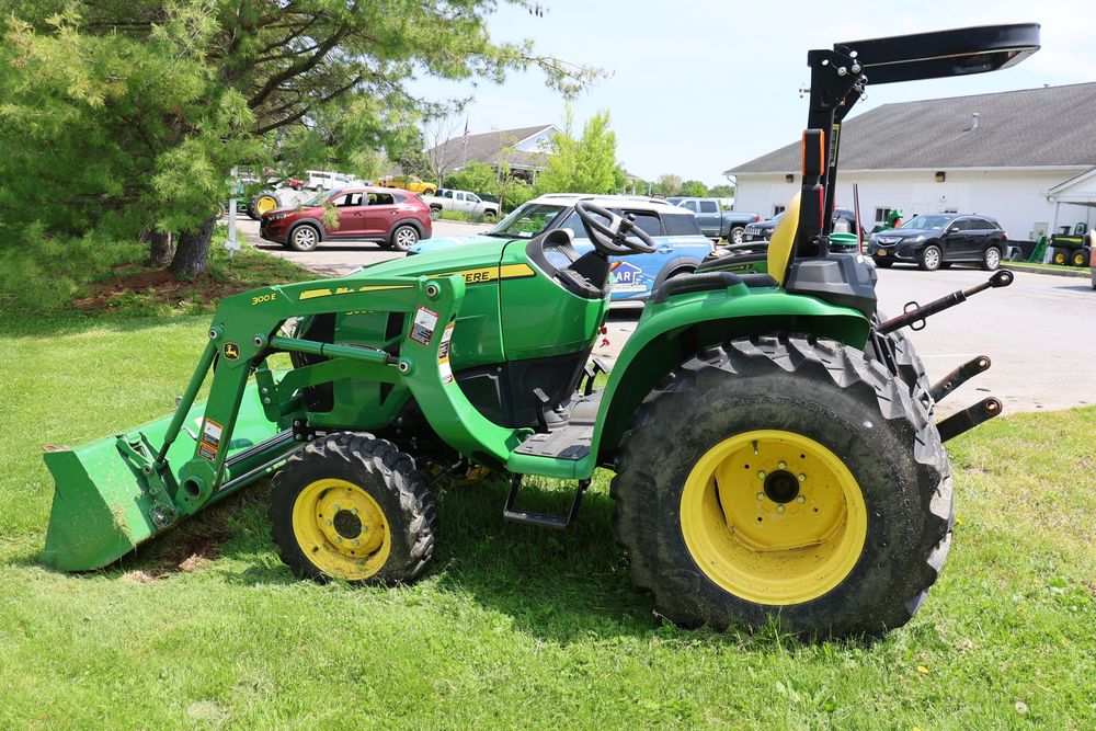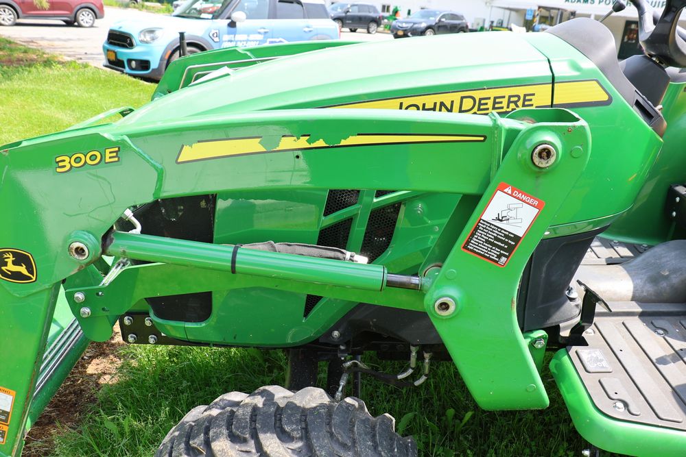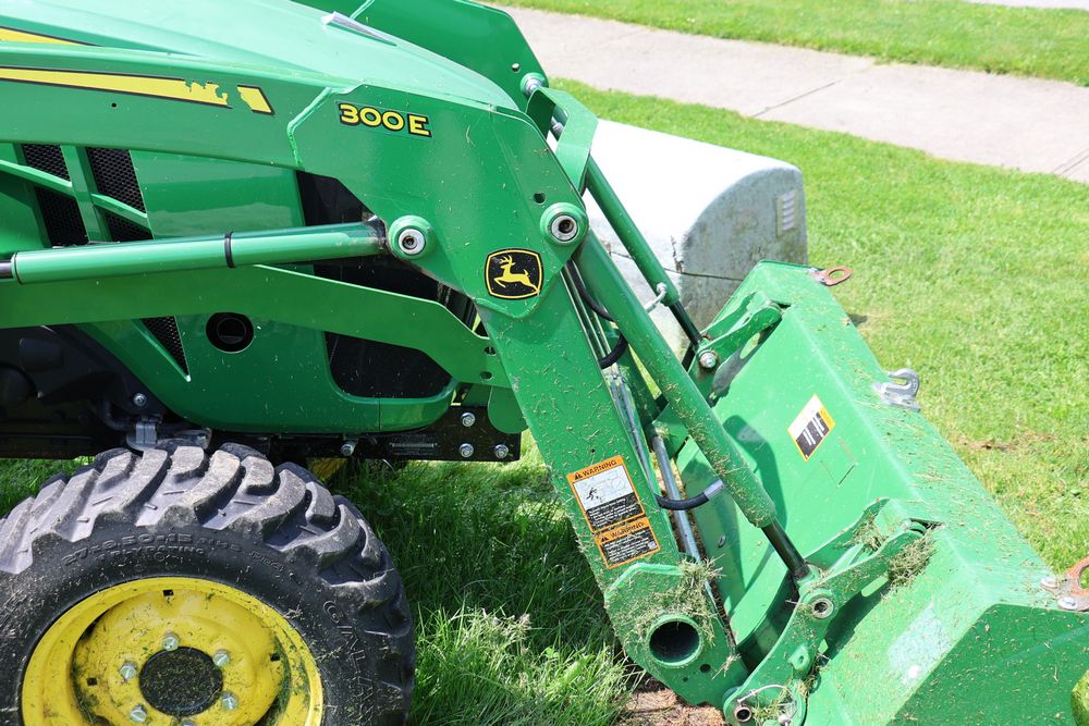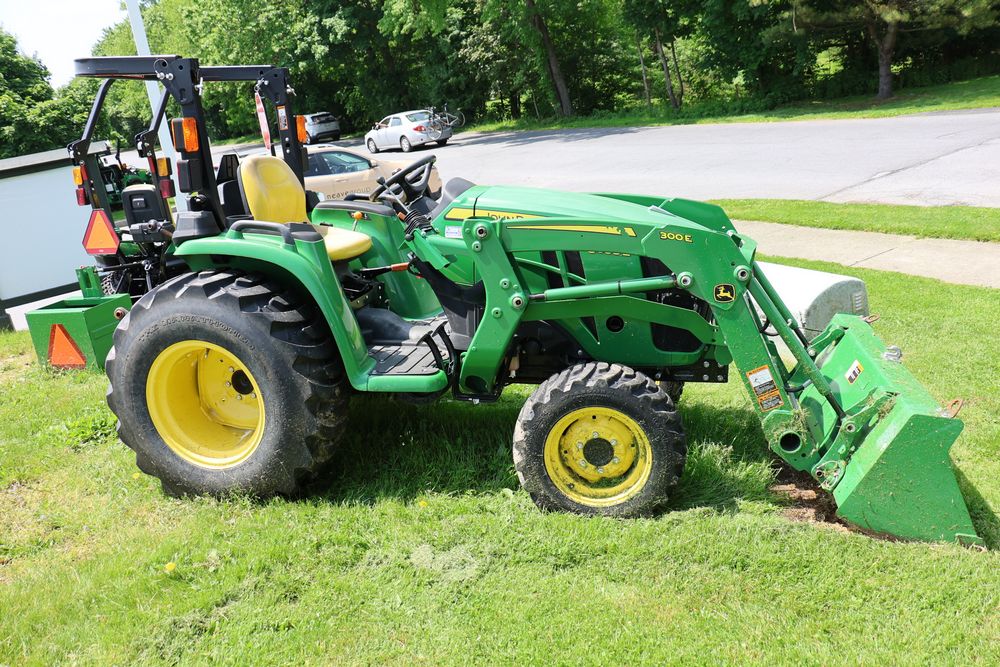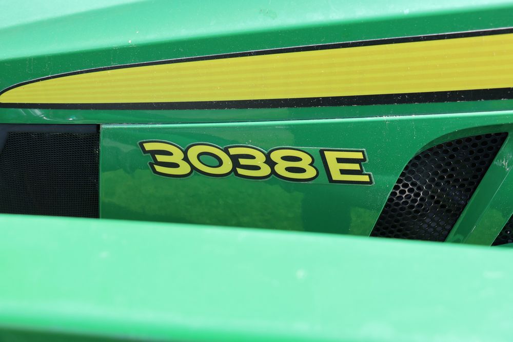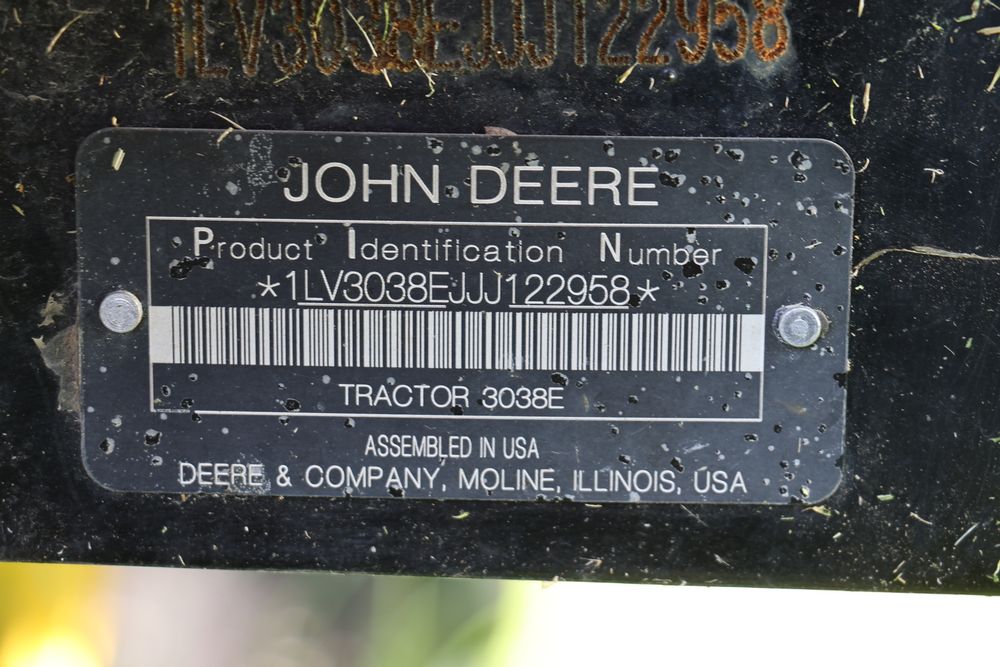 2020 John Deere tractor model 3038E with a 1.5L 3 cyl 37.1 hp diesel engine, John Deere model 300E loader with bucket, 43x16.00-20 rear tires, rear 3 point hitch. Hour meter reading 216.5. PIN: 1LV3038EJJJ122958. Runs, drives, and in good operating condition. Seller reports emissions warranty valid until 1/16/2025, powertrain warranty valid until 1/14/2026. Key available.