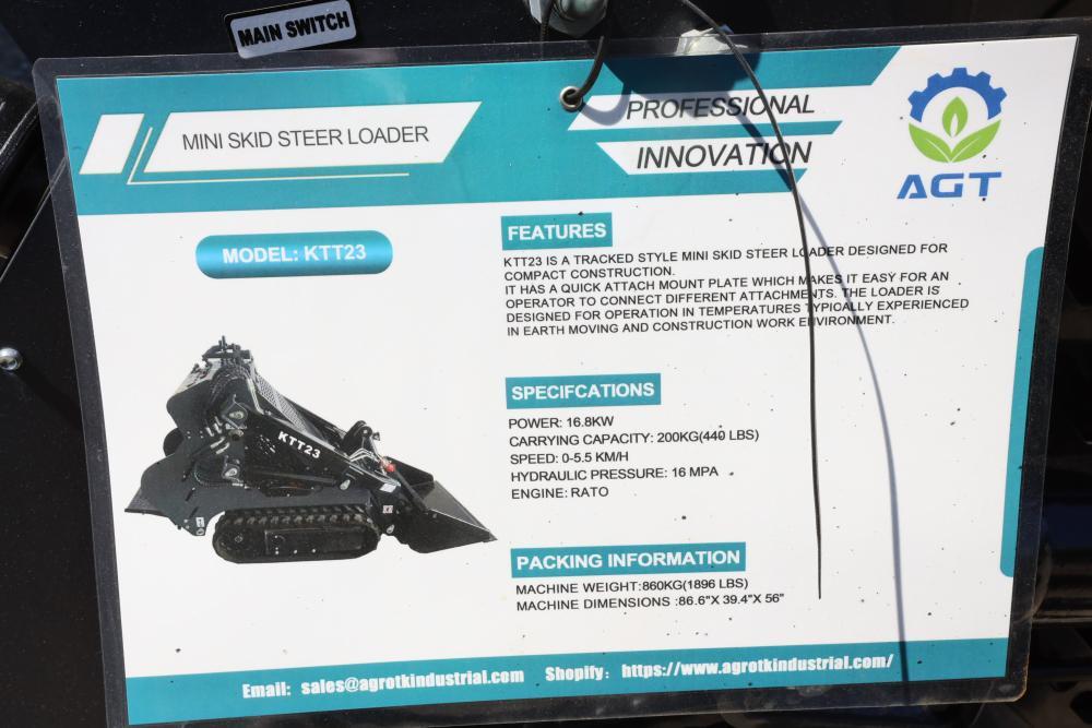 New 2024 AGT commercial ride-on Skid steer track loader model KTT23 with RATO EPA engine, 739CC, 920KG, with hand controls and front facing lights and auxiliary hydraulic lines with less then 1 hour.