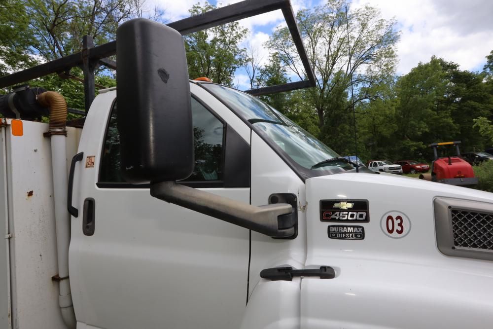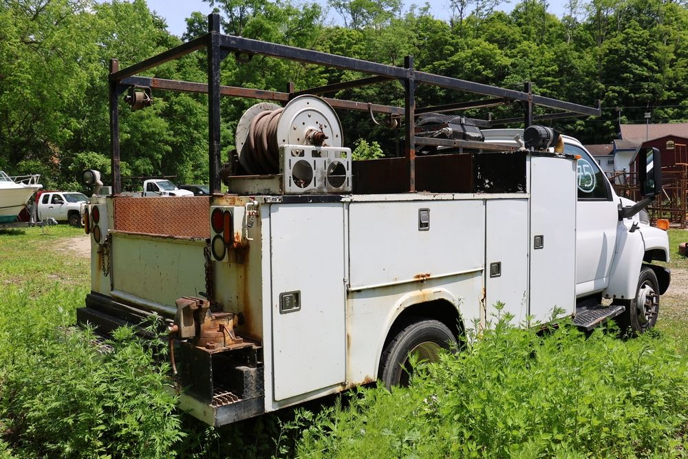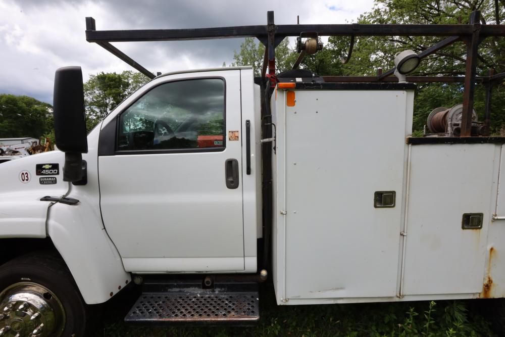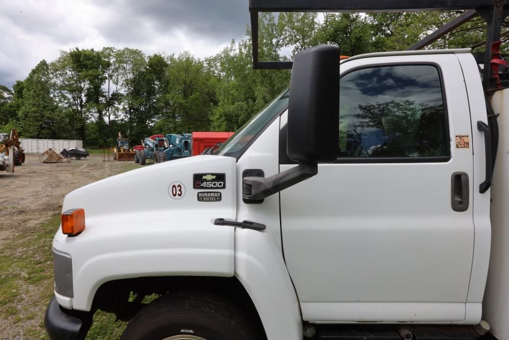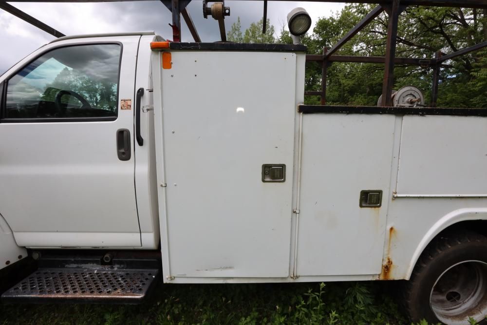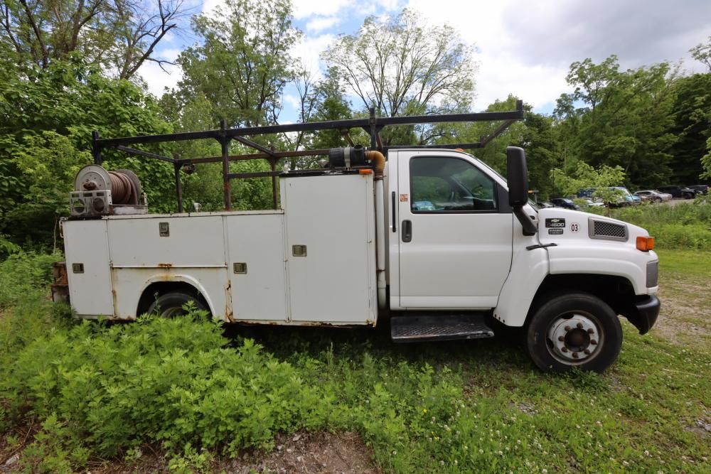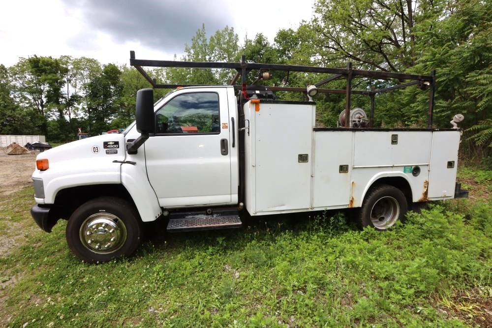 2006 Chevrolet C4500 w/ 6.6 Turbo V8 Duramax diesel engine 4x2 Utility truck VIN: 1GBE4C1226F423992 w/ leather interior, AM/FM radio, heat & A/C, roof rack, 8 bed storage compartments, air hose, bumper mounted vise, diamond plate truck bed. Odometer reading 161039. Has title, bill of sale & keys.