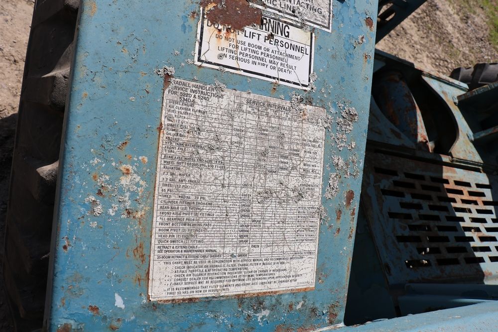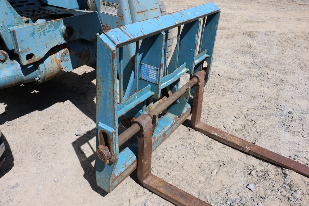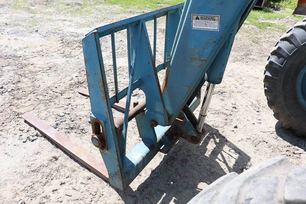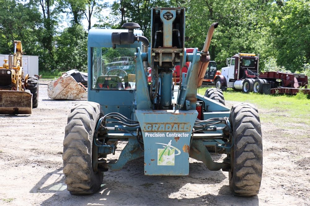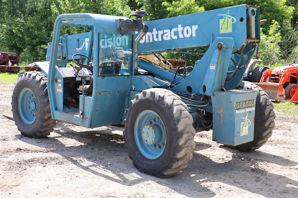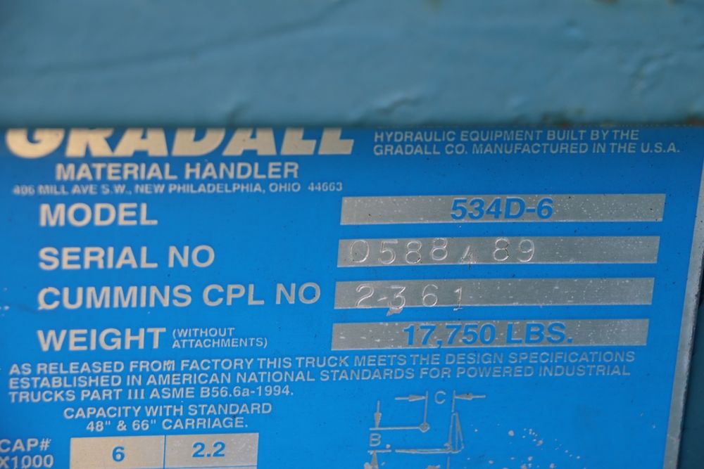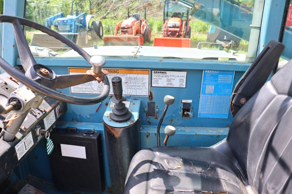 Gradall Material Handler 4x4 model 534D-6 with Cummins engine CPL NO 2361, canopy cover, hand a foot controls, Gradall fork attachment number 90455051. Hours reading 4865. Serial Number 0588489. Runs, drives, operates.