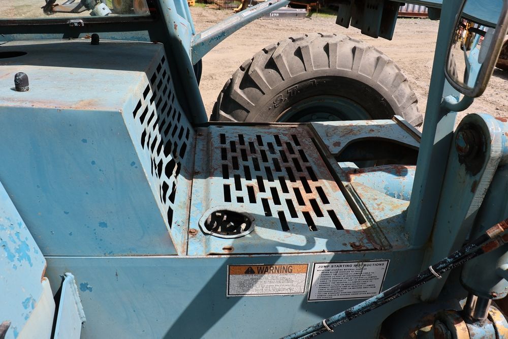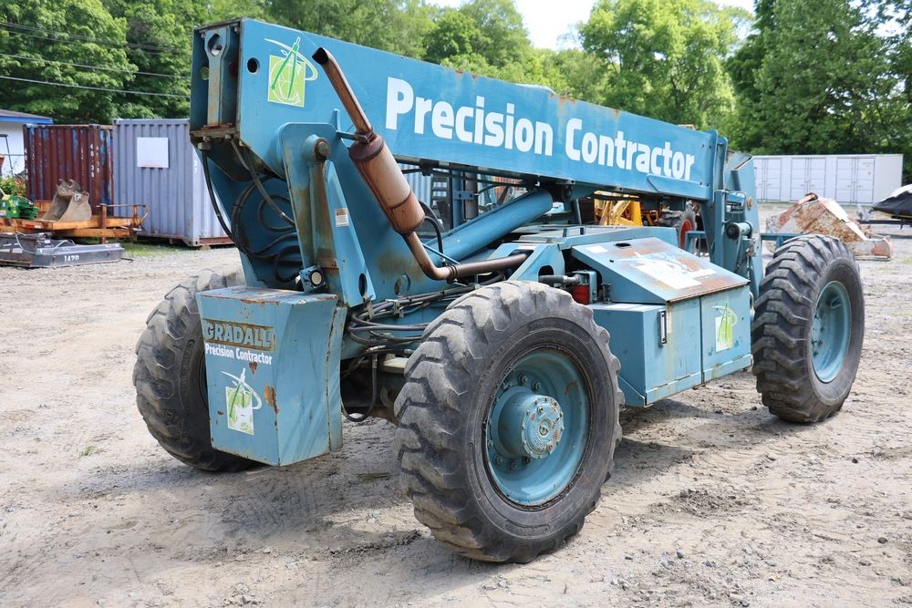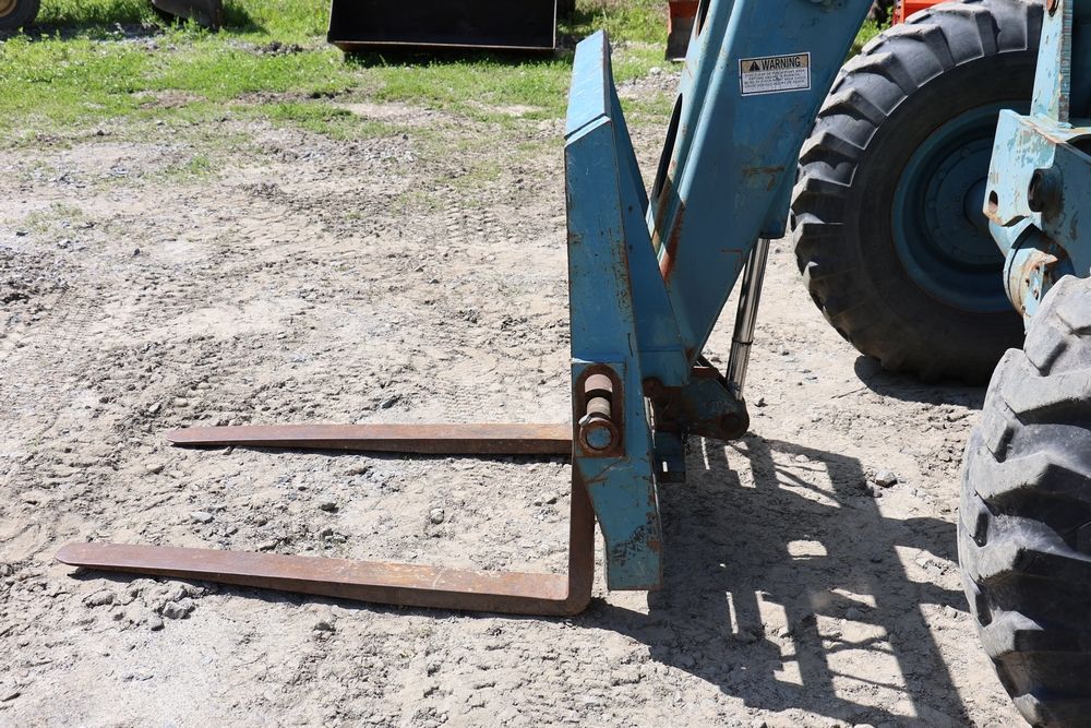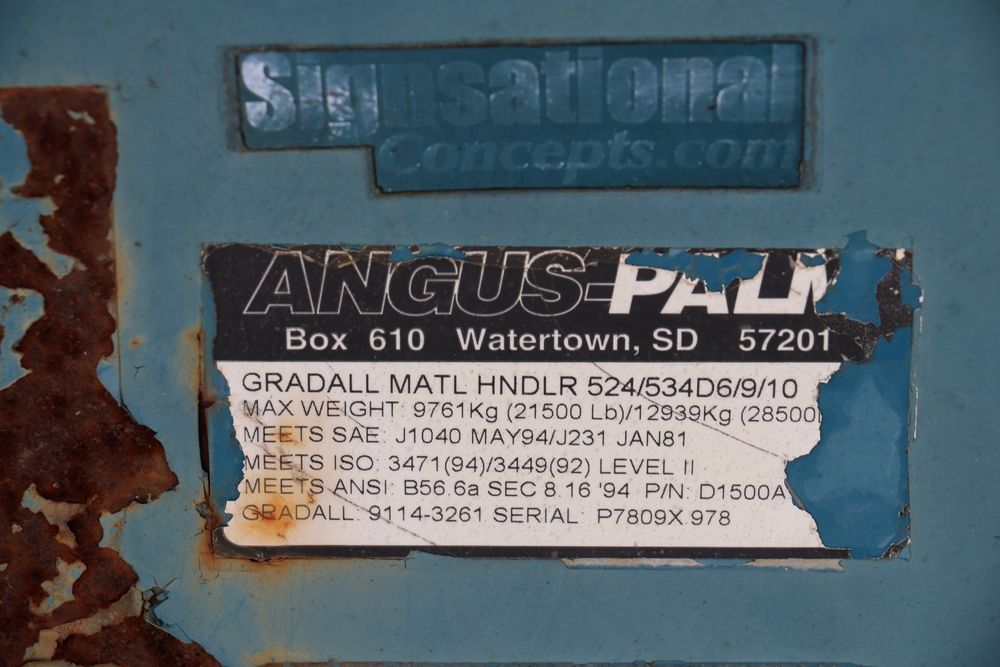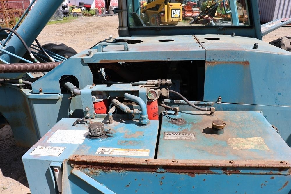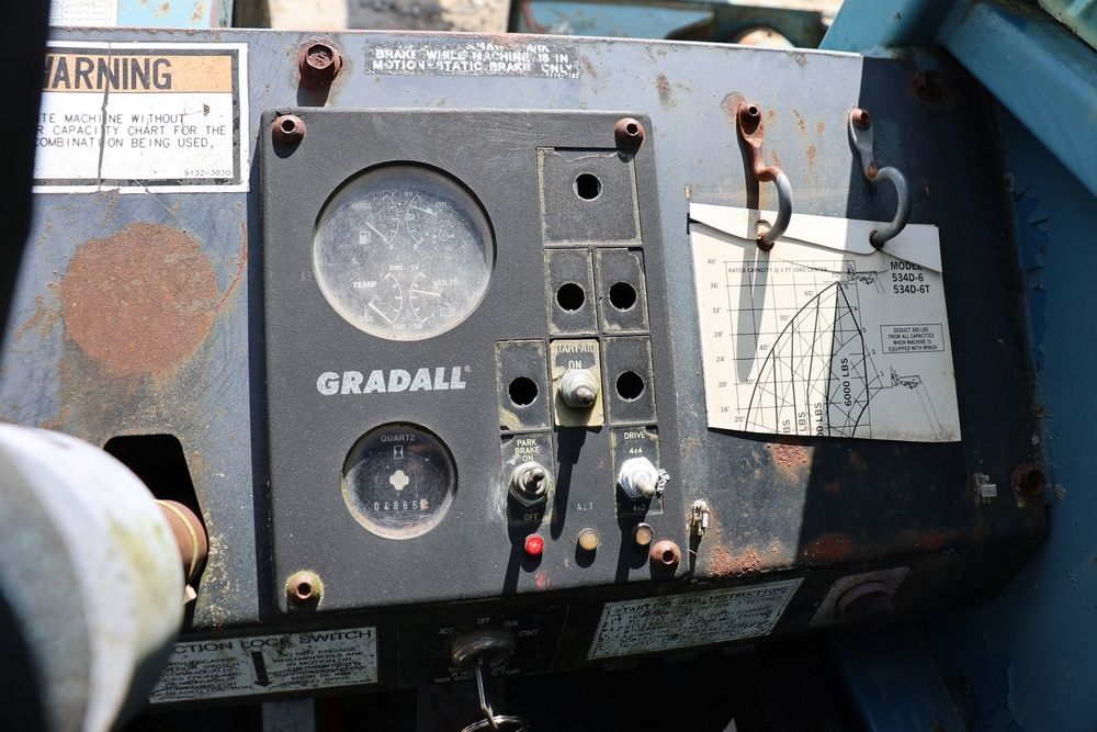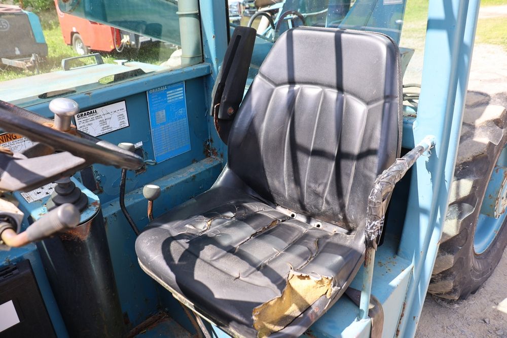 Gradall Material Handler 4x4 model 534D-6 with Cummins engine CPL NO 2361, canopy cover, hand a foot controls, Gradall fork attachment number 90455051. Hours reading 4865. Serial Number 0588489. Runs, drives, operates.