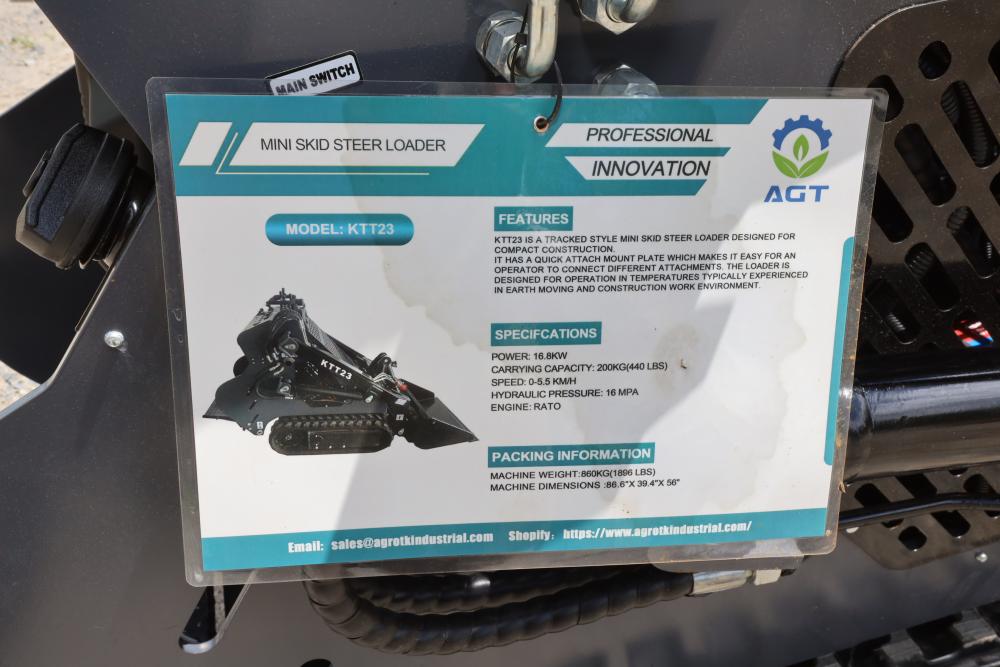 New 2024 AGT commercial ride-on Skid steer track loader model KTT23 with RATO EPA engine, 739CC, 920KG, with hand controls and front facing lights and auxiliary hydraulic lines with less then 1 hour. Serial Number A2312036305.
