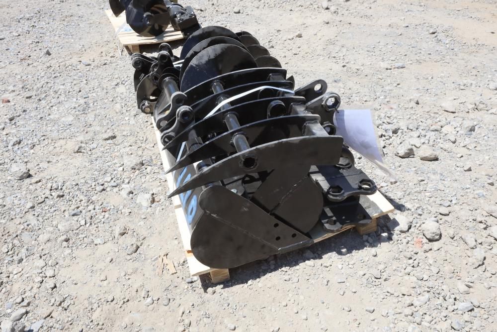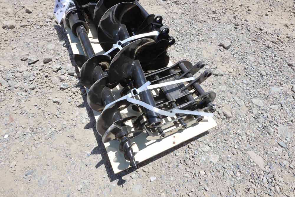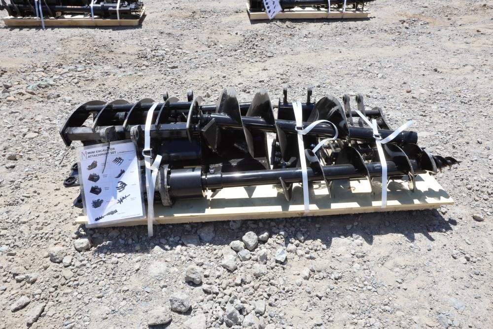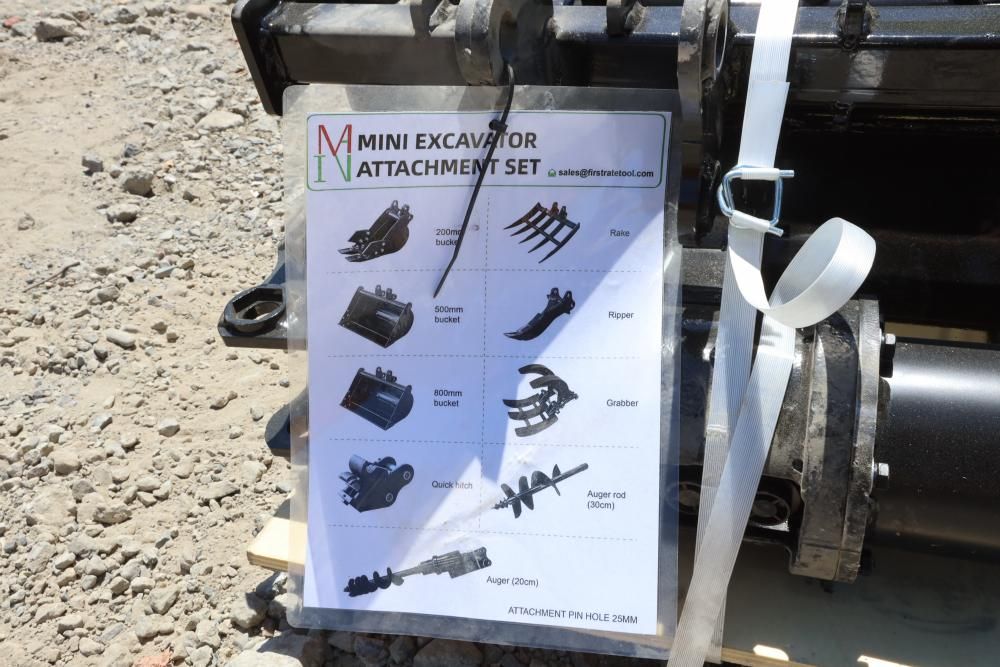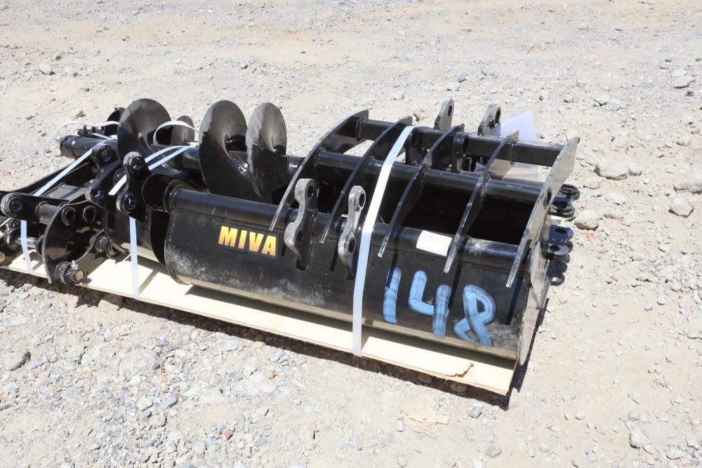 New MIVA Mini excavator attachment set including 200mm bucket, 500mm bucket, 800mm bucket, quick hitch, rake, ripper, grabber, auger rod 30cm, and auger 20cm.