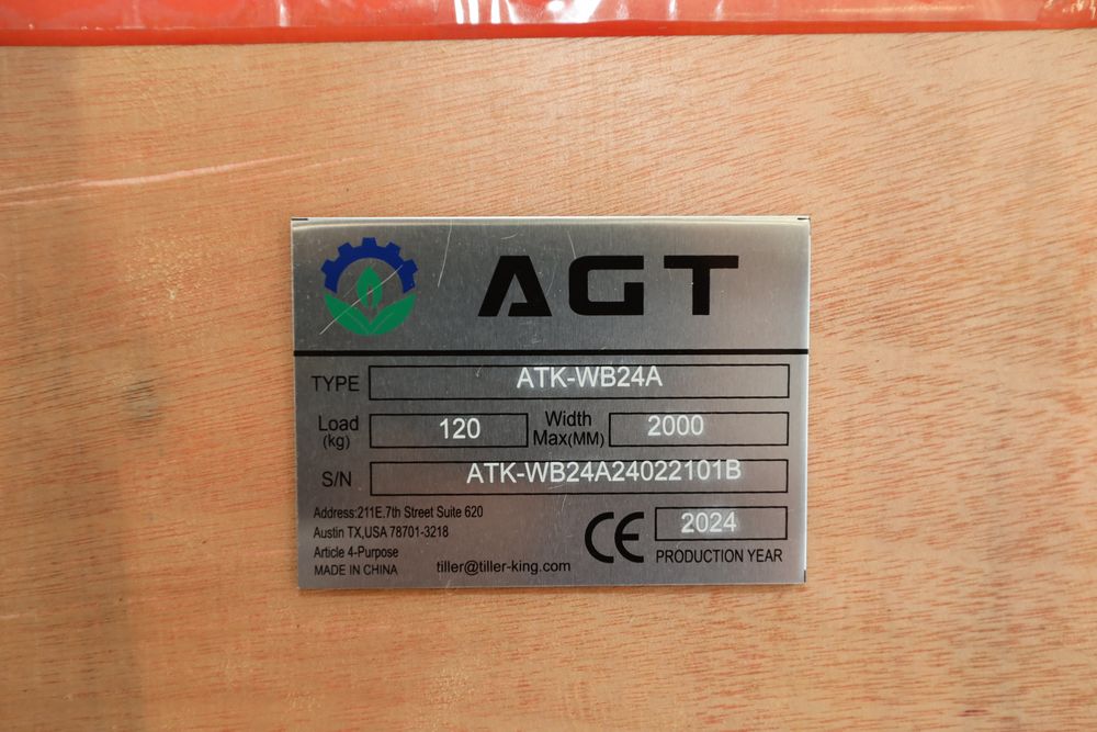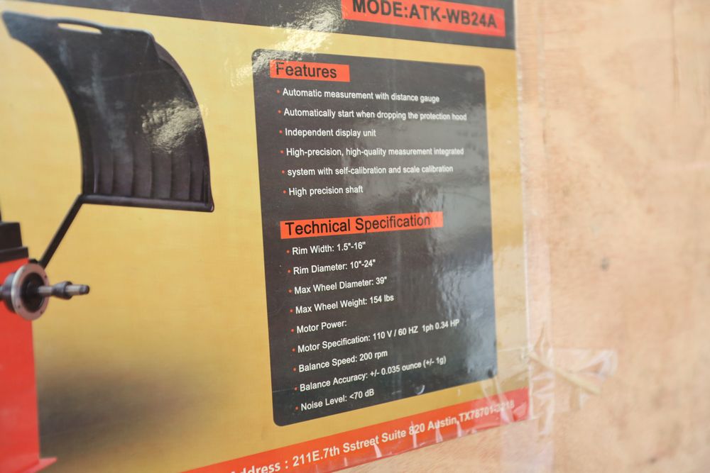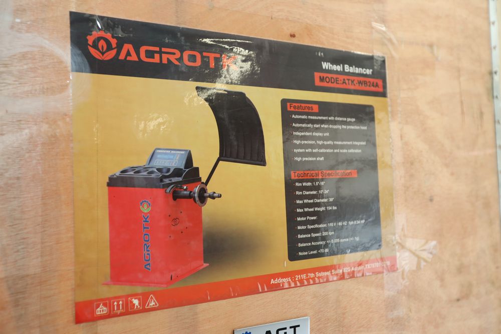 New 2024 AGROTK wheel balancer model ATK-WB24A, specifications include 10"-24" wheel diameter, max wheel diameter 39", 110 volt single phase, 200rpm balance speed. S/N: ATK-WB24A24022101B.