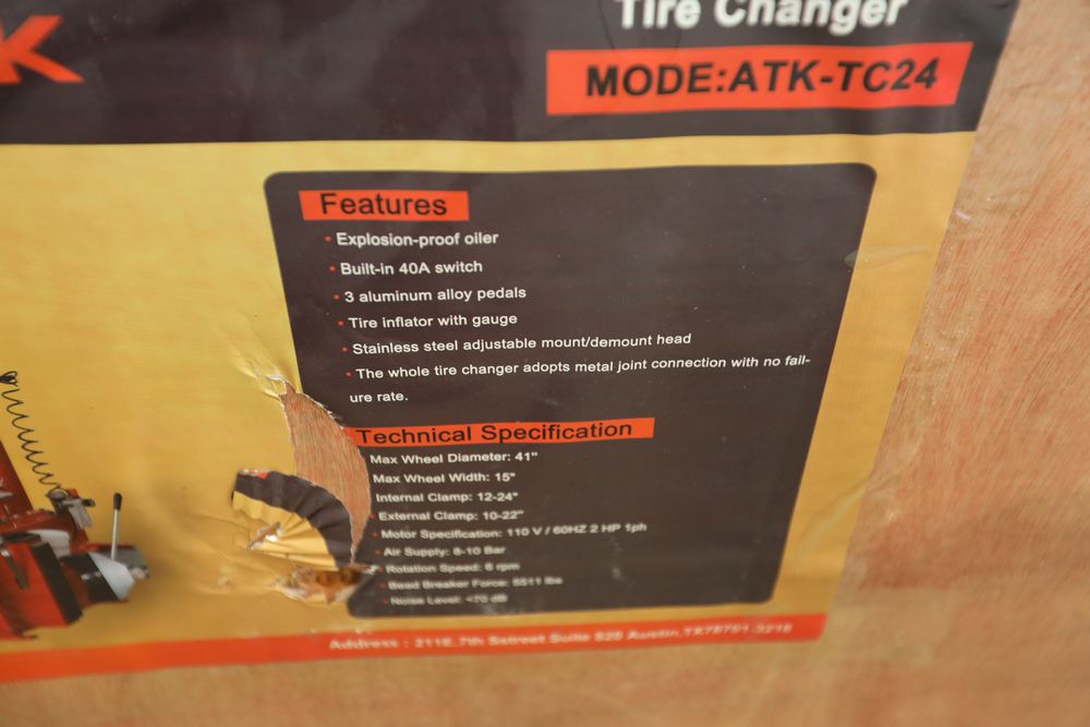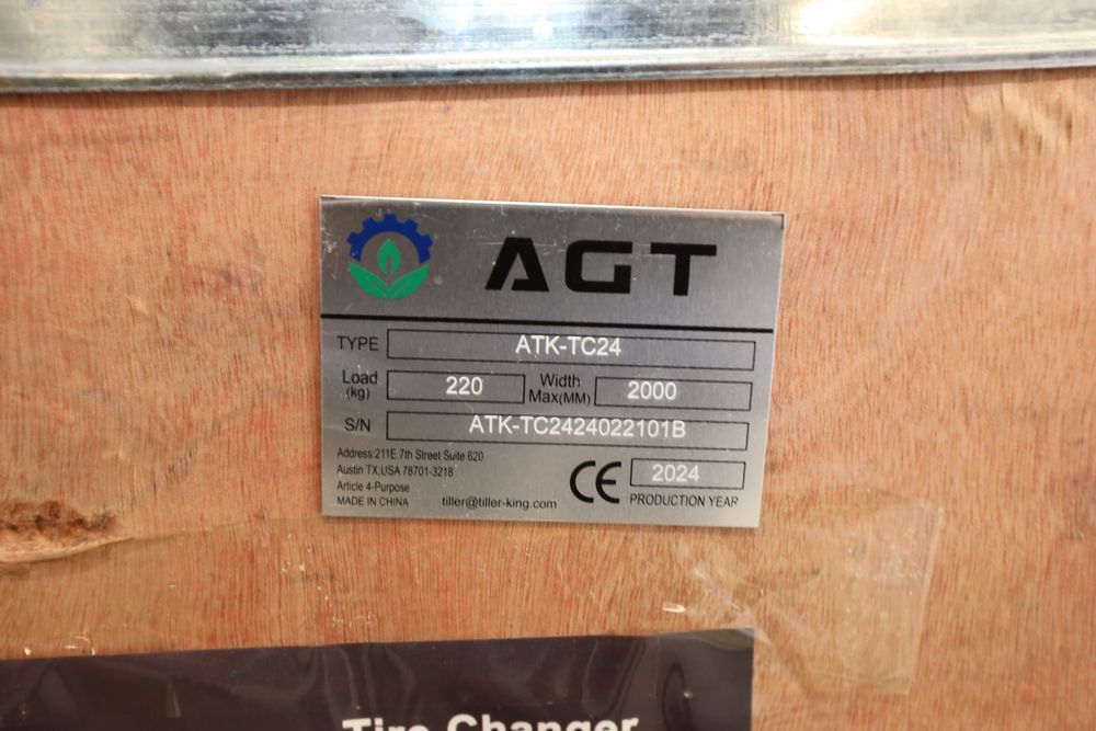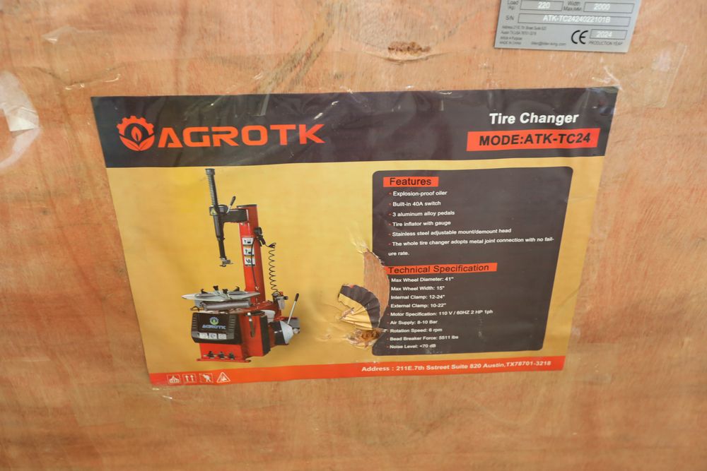 New 2024 AGROTK tire changer model number: ATK-TC24, specifications include 41" max wheel diameter, 12"-24" internal clamp, 10"-22" external clamp, bead breaker force of 5511 lbs. S/N: ATK-TC2424022101B.