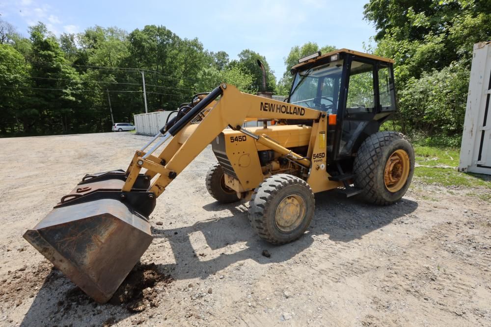 New Holland 545D bucket loader with enclosed cab, three point hitch, auxiliary hydraulics. Seller reports "New bucket curl pistons, new floor and support rails of cab, oil change and filters, new hydraulic filters, new upholstery, new flood lights, front and rear, new windshield pump and tank, owners manual, 4 speed trans with high low range, shuttle shift trans, RPM gauge Does not work, Hour meter Does not work, Unit has heat in cab. NO AC, original bucket pistons, fenders and tail lights available. Runs, drives, and operates.