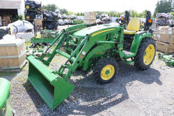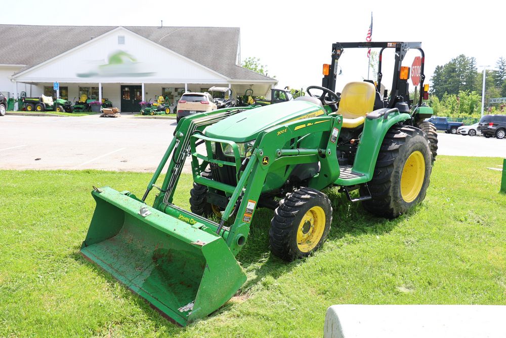 2020 John Deere tractor model 3038E with a 1.5L 3 cyl 37.1 hp diesel engine, John Deere model 300E loader with bucket, 43x16.00-20 rear tires, rear 3 point hitch. Hour meter reading 216.5. PIN: 1LV3038EJJJ122958. Runs, drives, and in good operating condition. Seller reports emissions warranty valid until 1/16/2025, powertrain warranty valid until 1/14/2026. Key available.