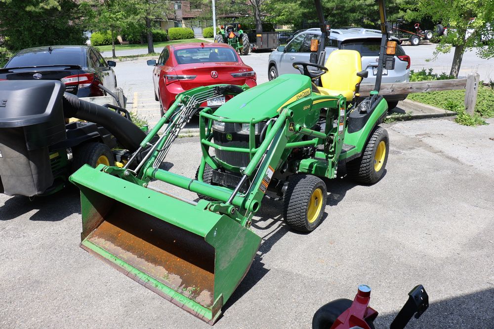 2017 John Deere tractor model 3039R with a 1.6L 3 cyl 38.2 hp diesel engine, John Deere model H165 loader with bucket, 11.2-24 Galaxy Agritrac II rear tires, rear 3 point hitch, front and rear PTO, Auto Connect 72D mowing deck model 72" Mower, and John Deere model 59 Snowblower, tractor engine hour meter reading 465.6. PIN: 1LV3039RVHH101467. Runs, drives, and in good operating condition. Key available.