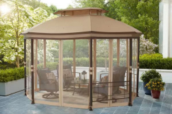 Seagrove 12'x10' Octagonal Steel Frame Gazebo With Tan Canopy. By Hampton Bay, Features Mosquito Net, Rust-Resistant Components, Powder Coated Steel Frame, Soft Top Grade: 1st,This is a liquidated product. Any pre-existing retail, wholesale or manufacturer warranties will not transfer with the sale of this Product unless expressly stated otherwise. Weight: 130. Sold by: Piece. Sold as: Quantity X Price. Inventory #: 10112-314293422