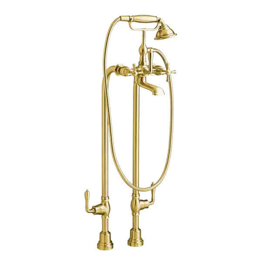 Satin Brass Transitional Floor Mount Bathtub Kit MSRP: $3198. By DXV, With Hand Shower Randall Cross Handles, 2.0 GPM, Grade: New,This is a liquidated product. Any pre-existing retail, wholesale or manufacturer warranties will not transfer with the sale of this Product unless expressly stated otherwise. Weight: X. Sold by: Piece. Sold as: Quantity X Price. Inventory #: 5045-D3510296C.427