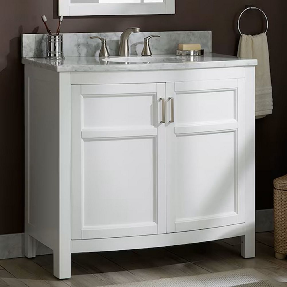 Moravia White 36"x34"x20" Single Basin Vanity. By Allen&Roth, with Carrara Marble Top, 4" Backsplash included, Grade; 1st Quality,This is a liquidated product. Any pre-existing retail, wholesale or manufacturer warranties will not transfer with the sale of this Product unless expressly stated otherwise. Weight: 188. Sold by: Piece. Sold as: Quantity X Price. Inventory #: 5081-50806-1083181