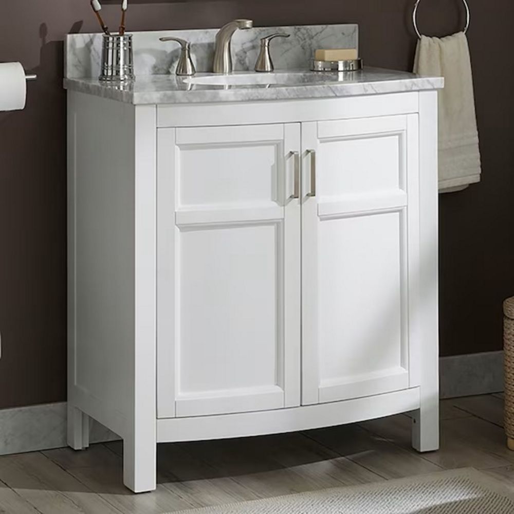 Moravia White 30"x34"x20" Single Basin Vanity. By Allen&Roth, with Carrara Marble Top, 4" Backsplash included, Grade; 1st Quality,This is a liquidated product. Any pre-existing retail, wholesale or manufacturer warranties will not transfer with the sale of this Product unless expressly stated otherwise. Weight: 168. Sold by: Piece. Sold as: Quantity X Price. Inventory #: 5081-50806-1083180