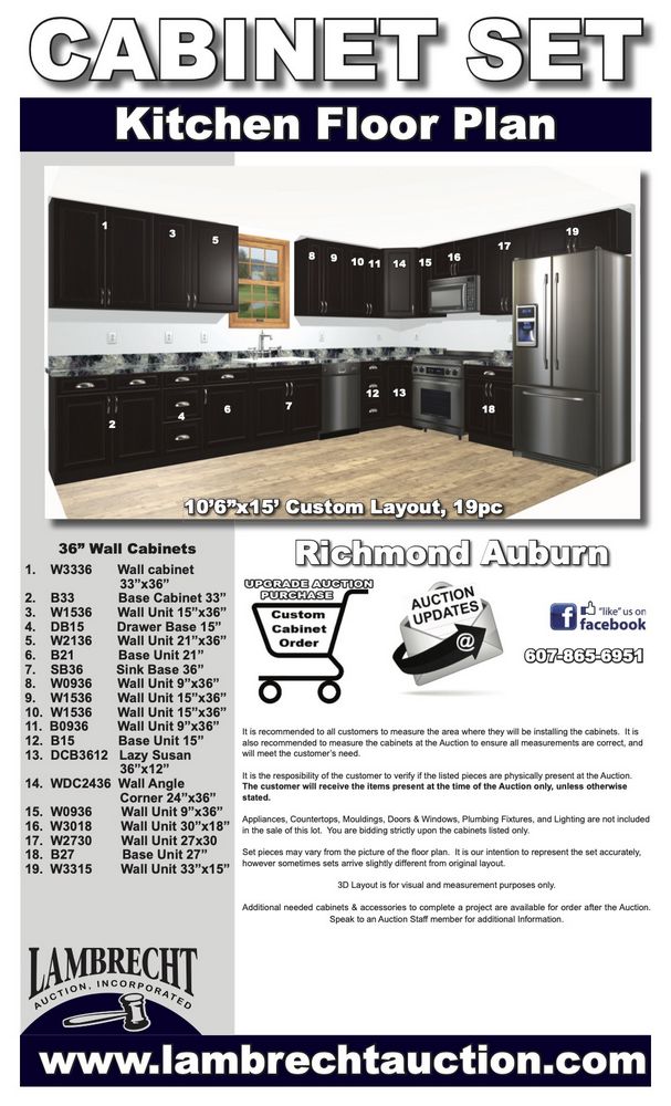 Richmond Auburn Kitchen Cabinet Set 10'6"x15'. Modified Custom Layout, 36" Walls, Note: The photos provided are to illustrate color, style, and hinge function, the lead photos shows layout and pieces. By GHI, ADDITIONAL CABINETS ARE UNAVAILABLE BECAUSE THIS PRODUCT LINE IS DISCONTINUED. -All Wood Construction -3/4” Solid Maple Face Frame -Solid Maple Raised Panel Door and Drawer Fronts with Veneer Center Panels -1/2” Plywood Box Construction with Wood Veneer Interiors and Exteriors -5/8” Plywood Shelf -Full Overlay Doors and Drawer Fonts -Solid wood Dovetail Drawer with Under Mount Glides -6-Way Adjustable Concealed Hinges - Enclosed in each cabinet set will be a Build Sheet which lists the individual cabinets in each set. As the cabinets are palletized each cabinet will be checked off and signed by our staff member to ensure that the set is complete at the time of pick-up. Please keep this Build Sheet on hand because it will be required if there is an issue with your cabinet set. Cabinet issues will not be addressed without this build sheet.,This is a liquidated product. The Auction Company makes no express or implied representations or warranties of any kind regarding the Product. Any pre-existing retail, wholesale or manufacturer warranties will not transfer with the sale of this Product unless expressly stated otherwise on this page. The Buyer accepts the Product in as-is condition, with all faults. Weight: X. Sold by: Set. Sold as: Quantity X Price. Inventory #: RMA-C 10'9"x15' W36 CUST