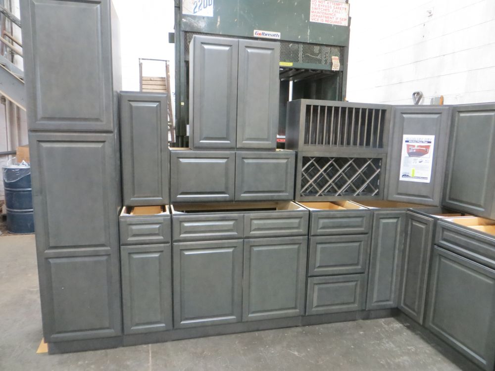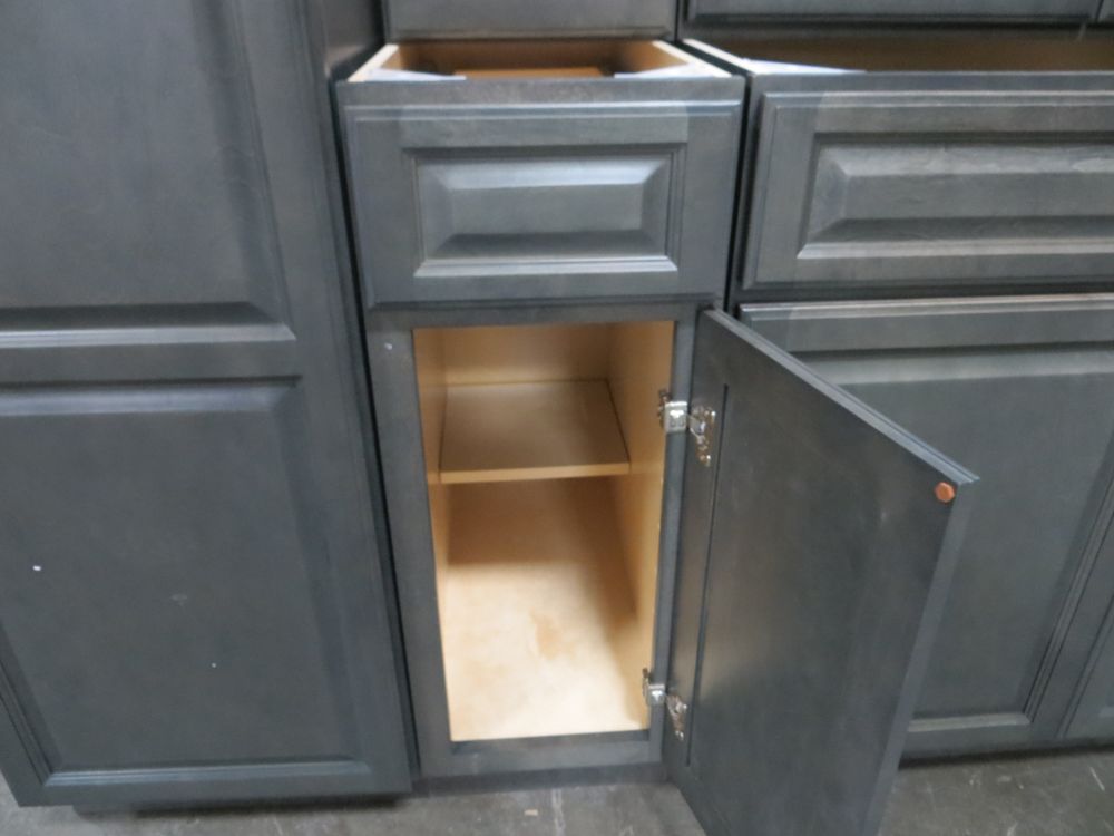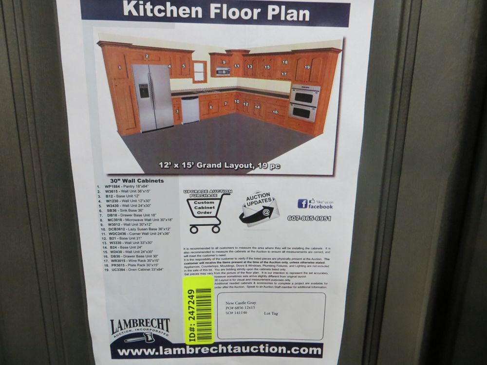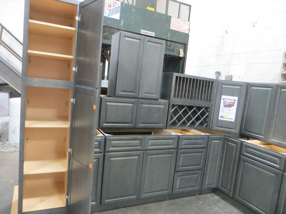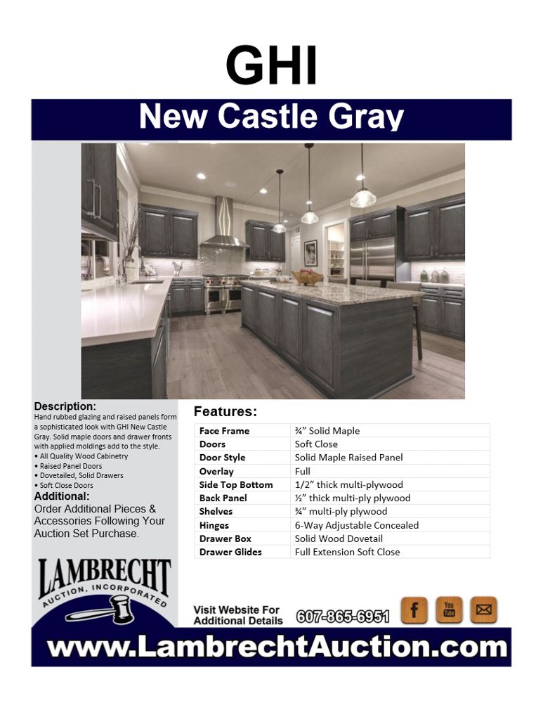 Newcastle Gray Kitchen Cabinet Set 12'x15'. Grand Layout, 30" Walls, By GHI. ADDITIONAL CABINETS ARE UNAVAILABLE BECAUSE THIS PRODUCT LINE IS DISCONTINUED. 3/4” Solid Maple Face Frame -Solid Maple Raised Panel Doors and Drawer Fronts -1/2” Plywood Box Construction with Wood Veneer Interiors and Exteriors -3/4” plywood Shelves -Full overlay Doors and Drawer Fronts -Solid Wood Dovetail Drawer Box -Soft Close Full Extension Drawer Gliders -Hand Rubbed Glaze -6-Way Adjustable Concealed Hinges -Soft Close. Enclosed in each cabinet set will be a Build Sheet which lists the individual cabinets in each set. As the cabinets are palletized each cabinet will be checked off and signed by our staff member to ensure that the set is complete at the time of pick-up. Please keep this Build Sheet on hand because it will be required if there is an issue with your cabinet set. Cabinet issues will not be addressed without this build sheet.,This is a liquidated product. The Auction Company makes no express or implied representations or warranties of any kind regarding the Product. Any pre-existing retail, wholesale or manufacturer warranties will not transfer with the sale of this Product unless expressly stated otherwise on this page. The Buyer accepts the Product in as-is condition, with all faults. Weight: X. Sold by: Set. Sold as: Quantity X Price. Inventory #: NCG-C 12x15 W30 GND