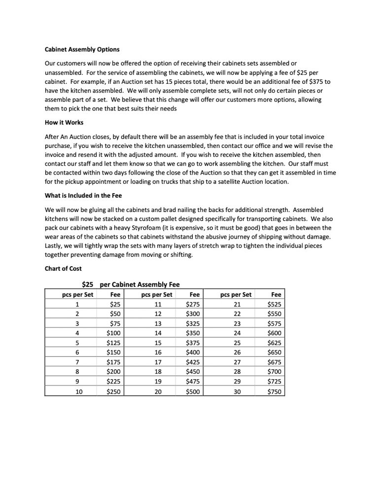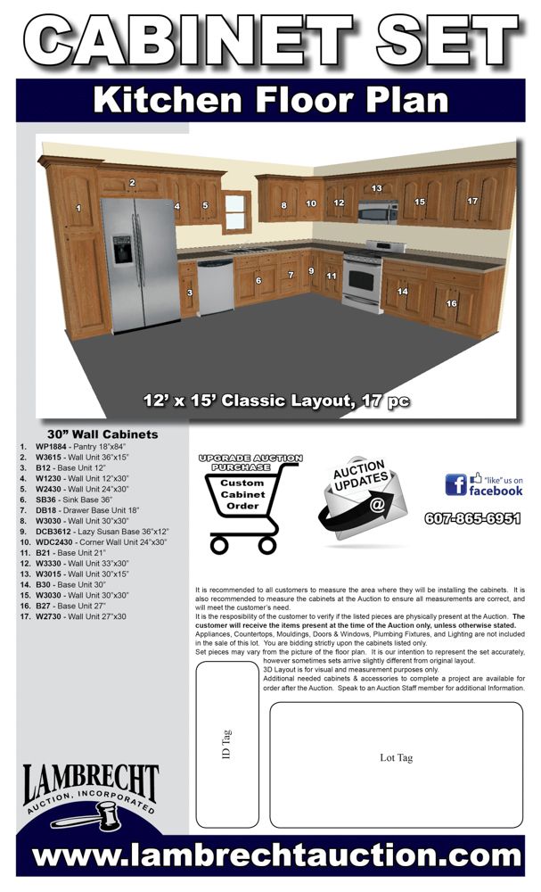 Arcadia White Kitchen Cabinet Set 12'x15'. Classic Layout, 30" Walls. By GHI, Additional pieces may be available for order to the high bidder. Additional cabinets ship boxed, ready to assemble. -3/4” Solid Wood Face Frame -High Density Fiberboard Shaker Style Door and Drawer Front -1/2” Plywood Box Construction -5/8” Plywood Shelves -Full Overlay Doors and Drawer Fronts -Solid Wood Dovetail Drawer box -Soft Close Full Extension Drawer Gliders -Soft Close Doors -6-Way Adjustable Concealed Hinges Enclosed in each cabinet set will be a Build Sheet which lists the individual cabinets in each set. As the cabinets are palletized each cabinet will be checked off and signed by our staff member to ensure that the set is complete at the time of pick-up. Please keep this Build Sheet on hand because it will be required if there is an issue with your cabinet set. Cabinet issues will not be addressed without this build sheet.,This is a liquidated product. The Auction Company makes no express or implied representations or warranties of any kind regarding the Product. Any pre-existing retail, wholesale or manufacturer warranties will not transfer with the sale of this Product unless expressly stated otherwise on this page. The Buyer accepts the Product in as-is condition, with all faults. Weight: X. Sold by: Set. Sold as: Quantity X Price. Inventory #: ACW-C 12X15 W30 CLS