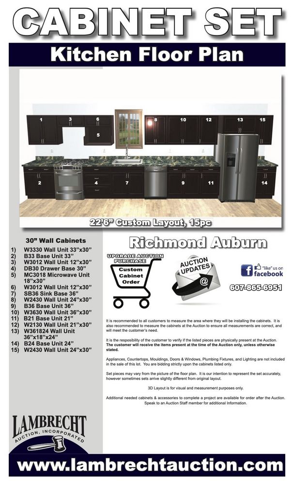 Richmond Auburn Kitchen Cabinet Set 22'6". Custom Modified Layout, 30" Walls. Note: The photos provided are to illustrate color, style, and hinge function, the lead photos shows layout and pieces. By GHI, ADDITIONAL CABINETS ARE UNAVAILABLE BECAUSE THIS PRODUCT LINE IS DISCONTINUED. -All Wood Construction -3/4” Solid Maple Face Frame -Solid Maple Raised Panel Door and Drawer Fronts with Veneer Center Panels -1/2” Plywood Box Construction with Wood Veneer Interiors and Exteriors -5/8” Plywood Shelf -Full Overlay Doors and Drawer Fonts -Solid wood Dovetail Drawer with Under Mount Glides -6-Way Adjustable Concealed Hinges - Enclosed in each cabinet set will be a Build Sheet which lists the individual cabinets in each set. As the cabinets are palletized each cabinet will be checked off and signed by our staff member to ensure that the set is complete at the time of pick-up. Please keep this Build Sheet on hand because it will be required if there is an issue with your cabinet set. Cabinet issues will not be addressed without this build sheet.,This is a liquidated product. The Auction Company makes no express or implied representations or warranties of any kind regarding the Product. Any pre-existing retail, wholesale or manufacturer warranties will not transfer with the sale of this Product unless expressly stated otherwise on this page. The Buyer accepts the Product in as-is condition, with all faults. Weight: X. Sold by: Set. Sold as: Quantity X Price. Inventory #: RMA-G 22.5 W30 CUST