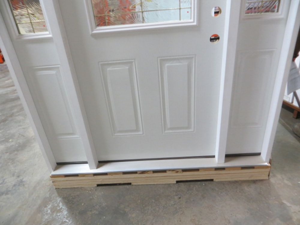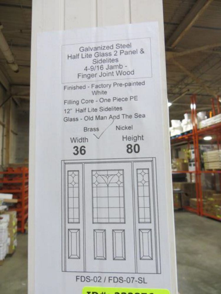 Decorative Entrance Door 36"x 80" with 2 Side lights LH FDS-02/FDS-42-SL. Prehung, Brass 22x36 Glass, Old man and The Sea Pattern,4/9/16 Jamb, Actual 63 3/8 x 81 1/2 Grade: A,This is a liquidated product. The Auction Company makes no express or implied representations or warranties of any kind regarding the Product. Any pre-existing retail, wholesale or manufacturer warranties will not transfer with the sale of this Product unless expressly stated otherwise on this page. The Buyer accepts the Product in as-is condition, with all faults. Weight: 190lbs. Sold by: Door. Sold as: Quantity X Price. Inventory #: 5212-OM&S 1-3-1 22X36 N