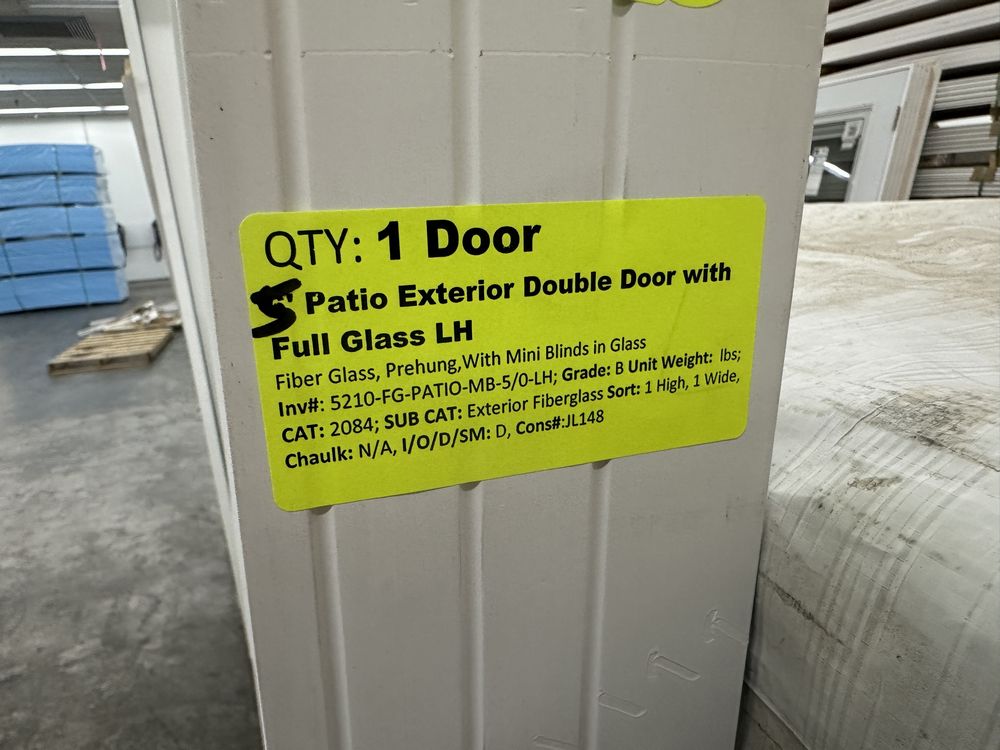 5' Exterior Double Patio Door with Full Glass, LH. Fiber Glass, Pre-Hung, with Mini Blinds in Glass, Left Handed, Grade: B,This is a liquidated product. The Auction Company makes no express or implied representations or warranties of any kind regarding the Product. Any pre-existing retail, wholesale or manufacturer warranties will not transfer with the sale of this Product unless expressly stated otherwise on this page. The Buyer accepts the Product in as-is condition, with all faults. Weight: X. Sold by: Door. Sold as: Quantity X Price. Inventory #: 5210-FG-PATIO-MB-5/0-LH