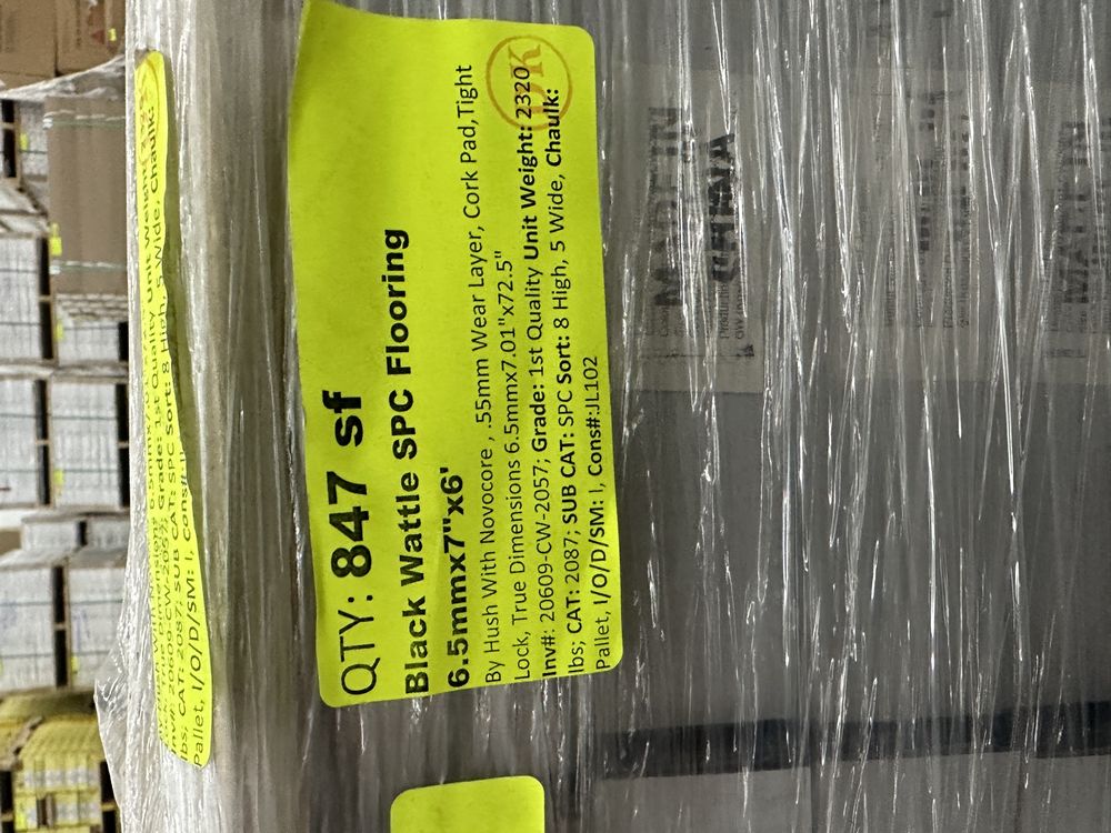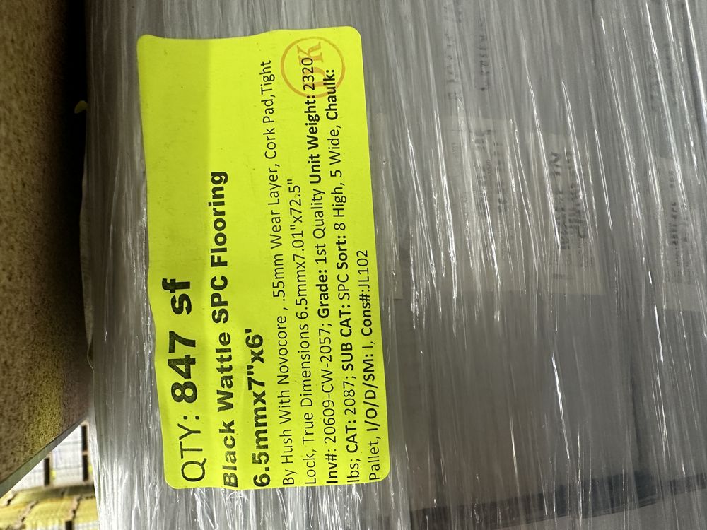 Black Wattle SPC Flooring 6.5mmx7"x6'. By Hush With Novocore, .55 mm Wear Layer, Cork Pad, Tight Lock, True Dimensions 6.5mmx7.01"x72.5" Grade: 1st Quality,This is a liquidated product. The Auction Company makes no express or implied representations or warranties of any kind regarding the Product. Any pre-existing retail, wholesale or manufacturer warranties will not transfer with the sale of this Product unless expressly stated otherwise on this page. The Buyer accepts the Product in as-is condition, with all faults. Weight: 2320. Sold by: Square Foot. Sold as: Quantity X Price. Inventory #: 20609-CW-2057