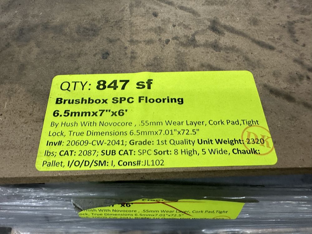 Brushbox SPC Flooring 6.5mmx7"x6'. By Hush With Novocore, .55mm Wear Layer, Cork Pad, Tight Lock, True Dimensions 6.5mmx7.01"x72.5" 6 pieces per box, 40 boxes, Grade: 1st,This is a liquidated product. The Auction Company makes no express or implied representations or warranties of any kind regarding the Product. Any pre-existing retail, wholesale or manufacturer warranties will not transfer with the sale of this Product unless expressly stated otherwise on this page. The Buyer accepts the Product in as-is condition, with all faults. Weight: 2320. Sold by: Square Foot. Sold as: Quantity X Price. Inventory #: 20609-CW-2041
