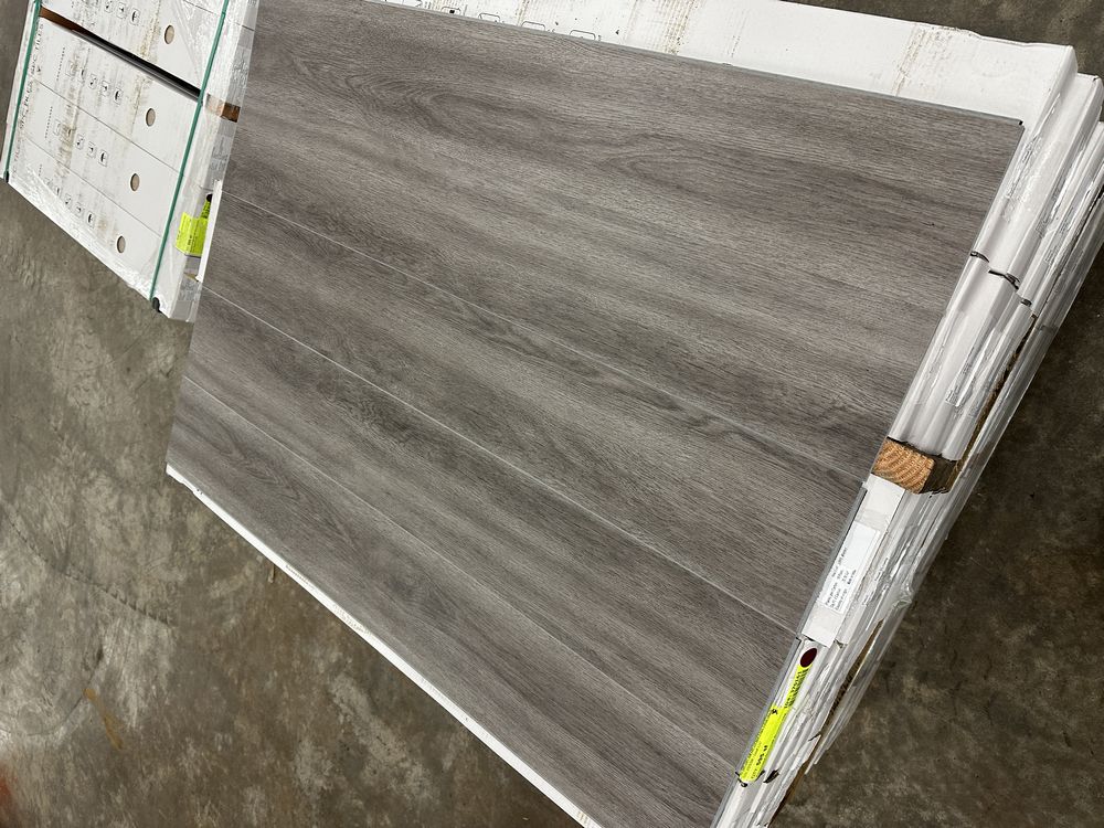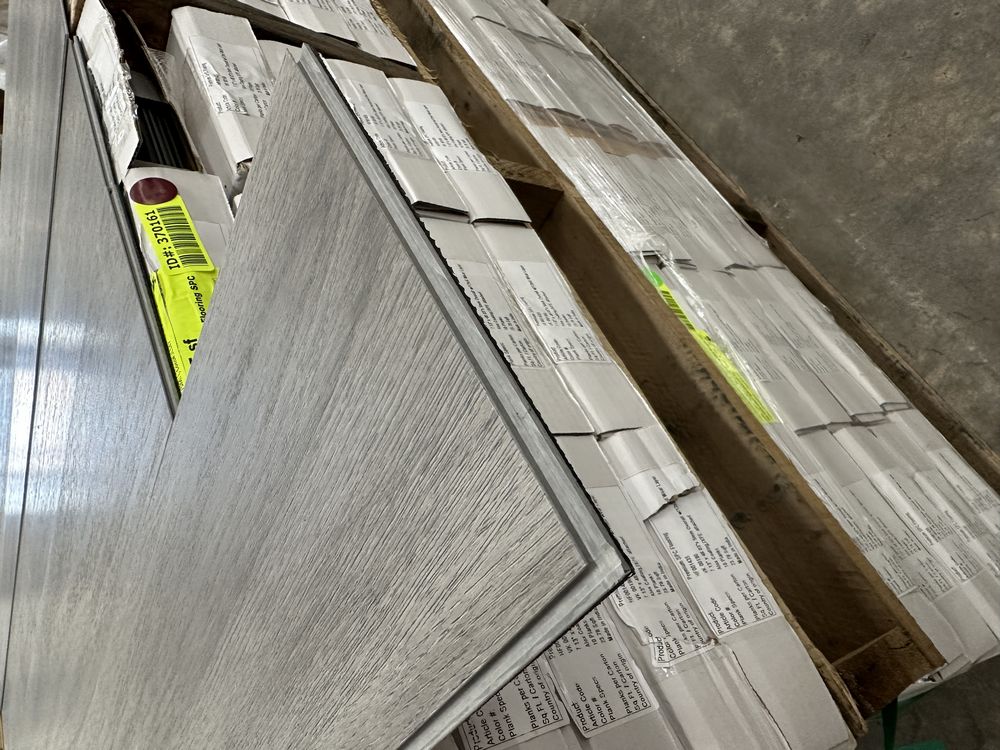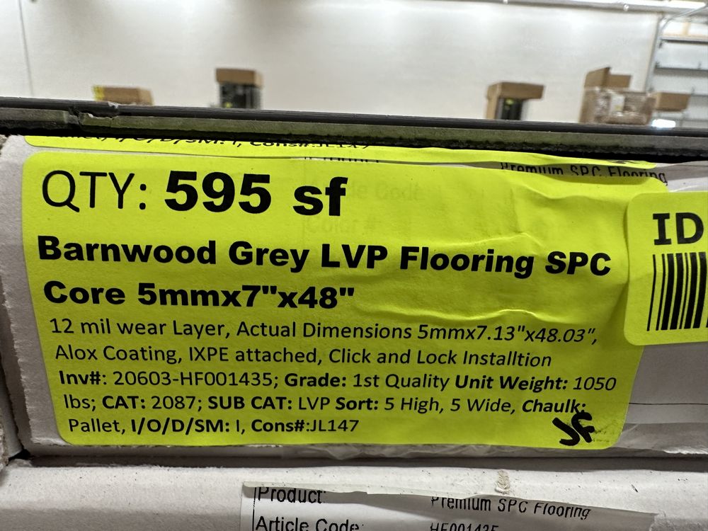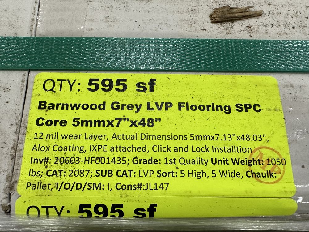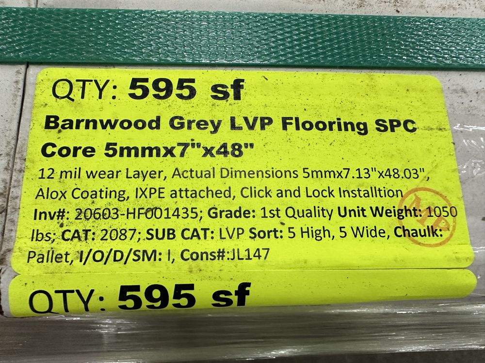 Barnwood Grey LVP Flooring SPC Core 5mmx7"x48". 12 mil wear layer, Actual Dimensions 5mmx7.13"x48.03", Alox Coating, IXPE Attached, Click and Lock Installation, 23.78 Square Foot per Box, 10 pieces per box, 25 Boxes, Grade: 1st Quality.,This is a liquidated product. The Auction Company makes no express or implied representations or warranties of any kind regarding the Product. Any pre-existing retail, wholesale or manufacturer warranties will not transfer with the sale of this Product unless expressly stated otherwise on this page. The Buyer accepts the Product in as-is condition, with all faults. Weight: 1050. Sold by: Square Foot. Sold as: Quantity X Price. Inventory #: 20603-HF001435