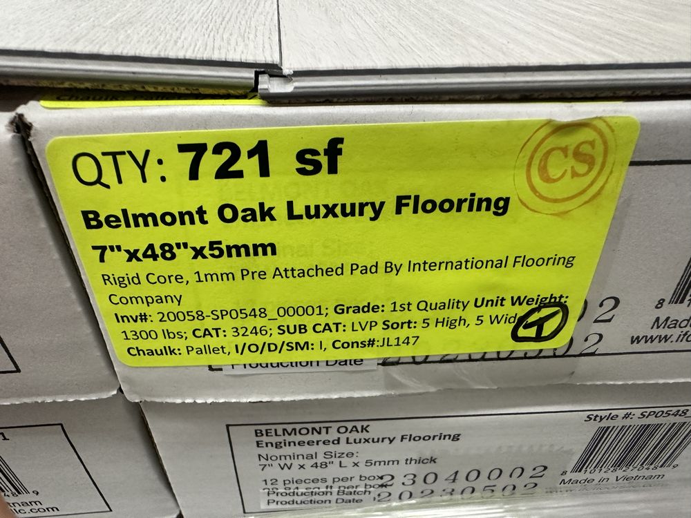 Belmont Oak Luxury Flooring 7"x48"x5mm. Rigid Core, 1mm Pre Attached Pad By International Flooring Company, 12 Pieces Per Box, 28.84 Square Foot Per Box, 25 Boxes Per Pallet, Grade: 1st Quality,This is a liquidated product. The Auction Company makes no express or implied representations or warranties of any kind regarding the Product. Any pre-existing retail, wholesale or manufacturer warranties will not transfer with the sale of this Product unless expressly stated otherwise on this page. The Buyer accepts the Product in as-is condition, with all faults. Weight: 1300. Sold by: Square Foot. Sold as: Quantity X Price. Inventory #: 20058-SP0548_0001