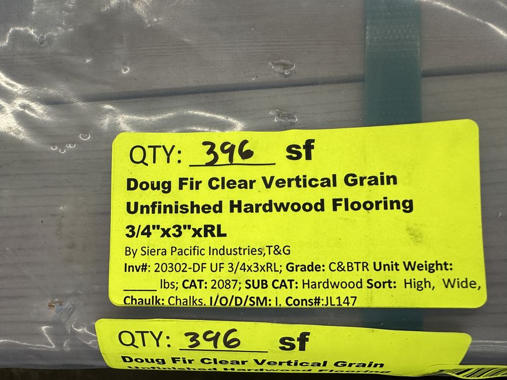 Doug Fir Clear Vertical Grain Unfinished Hardwood Flooring 3/4"x3"x3'-5'. By Sierra Pacific Industries, T&G, 120 3' pieces, 132 4' pieces, 138 5' pieces, Grade: C&BTR.,This is a liquidated product. The Auction Company makes no express or implied representations or warranties of any kind regarding the Product. Any pre-existing retail, wholesale or manufacturer warranties will not transfer with the sale of this Product unless expressly stated otherwise on this page. The Buyer accepts the Product in as-is condition, with all faults. Weight: X. Sold by: Square Foot. Sold as: Quantity X Price. Inventory #: 20302-DF UF 3/4x3xRL
