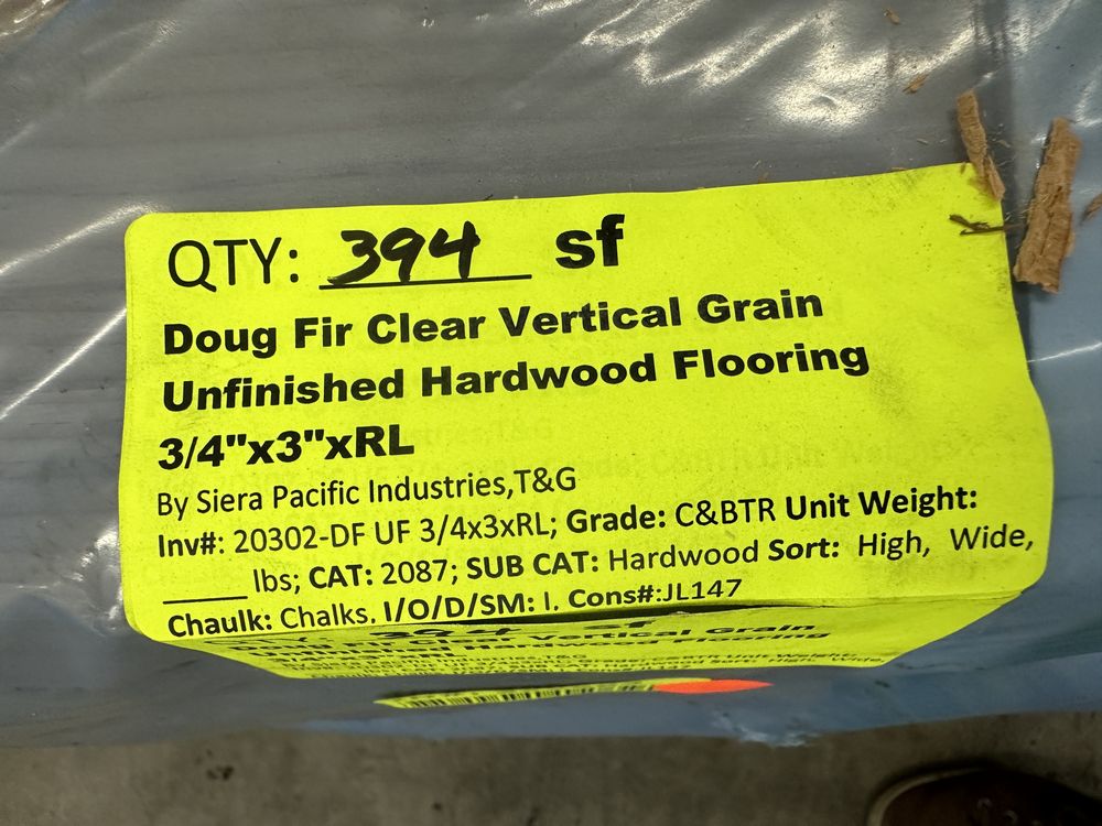 Doug Fir Clear Vertical Grain Unfinished T&G Hardwood Flooring 3/4"x3"x3'-5'. By Sierra Pacific Industries, 146 3' pieces, 88 4' pieces, 156 5' pieces, Grade: C&BTR,This is a liquidated product. The Auction Company makes no express or implied representations or warranties of any kind regarding the Product. Any pre-existing retail, wholesale or manufacturer warranties will not transfer with the sale of this Product unless expressly stated otherwise on this page. The Buyer accepts the Product in as-is condition, with all faults. Weight: X. Sold by: Square Foot. Sold as: Quantity X Price. Inventory #: 20302-DF UF 3/4x3xRL