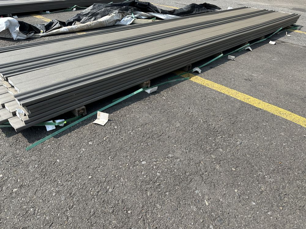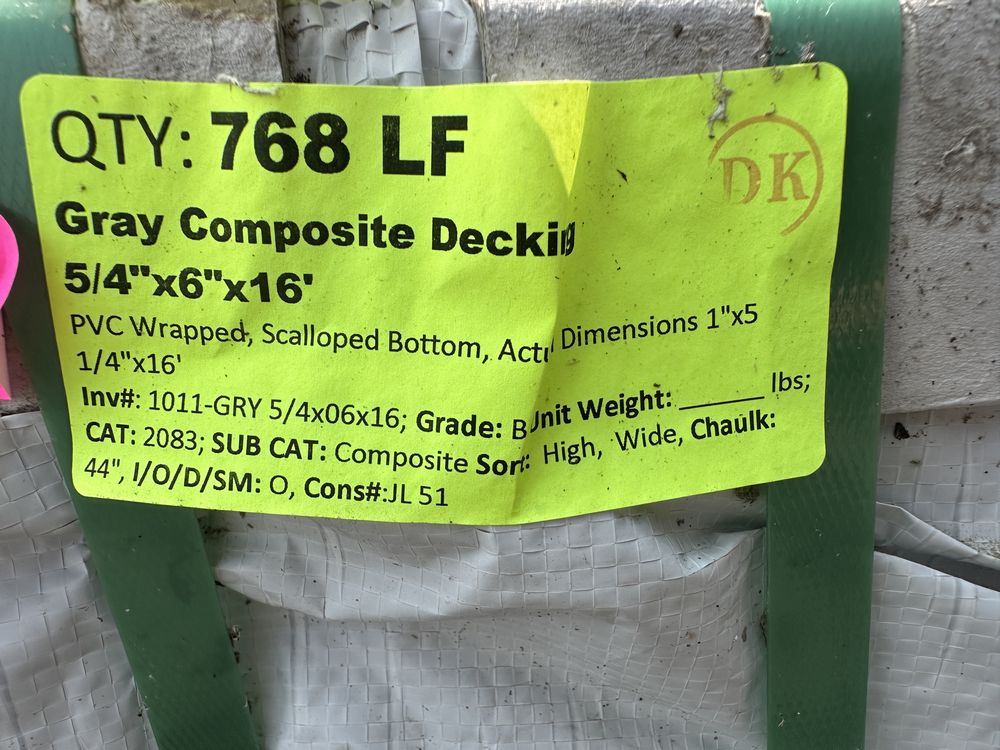 Gray Composite Decking 5/4"x6"x16'. PVC Wrapped, 48 Boards Total, Scalloped Bottom, Flat Edge, Actual Dimensions 1"x5 1/4"x16' Grade: B,This is a liquidated product. The Auction Company makes no express or implied representations or warranties of any kind regarding the Product. Any pre-existing retail, wholesale or manufacturer warranties will not transfer with the sale of this Product unless expressly stated otherwise on this page. The Buyer accepts the Product in as-is condition, with all faults. Weight: x. Sold by: Linear Foot. Sold as: Quantity X Price. Inventory #: 1011-GRY 5/4x06x16