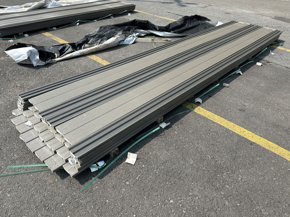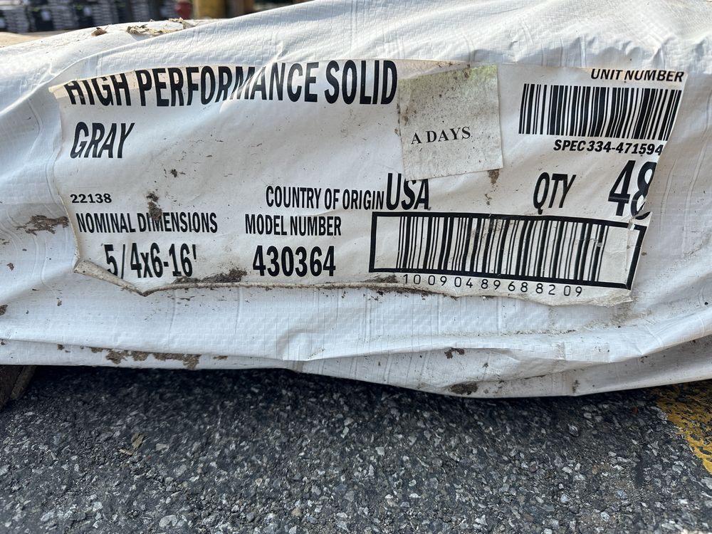 Gray Composite Decking 5/4"x6"x16'. PVC Wrapped, 48 Boards Total, Scalloped Bottom, Flat Edge, Actual Dimensions 1"x5 1/4"x16' Grade: B,This is a liquidated product. The Auction Company makes no express or implied representations or warranties of any kind regarding the Product. Any pre-existing retail, wholesale or manufacturer warranties will not transfer with the sale of this Product unless expressly stated otherwise on this page. The Buyer accepts the Product in as-is condition, with all faults. Weight: x. Sold by: Linear Foot. Sold as: Quantity X Price. Inventory #: 1011-GRY 5/4x06x16