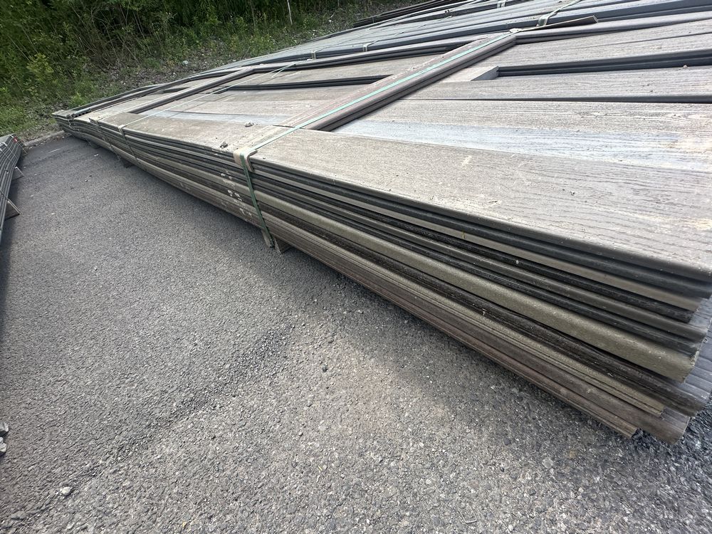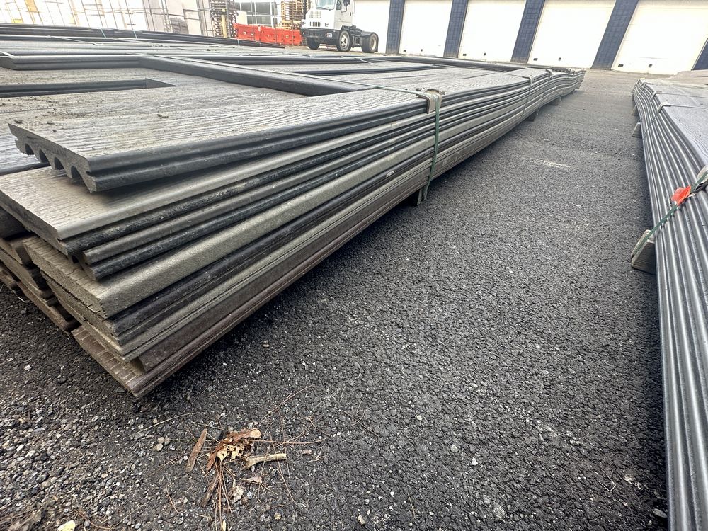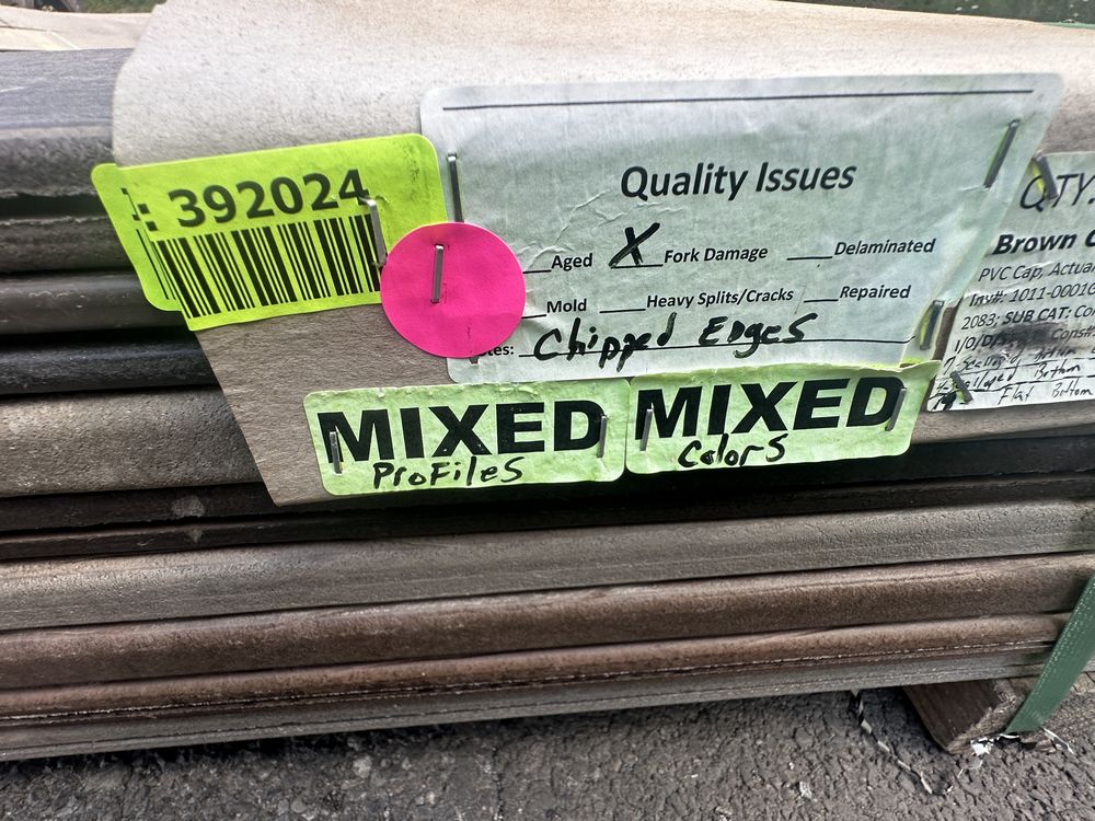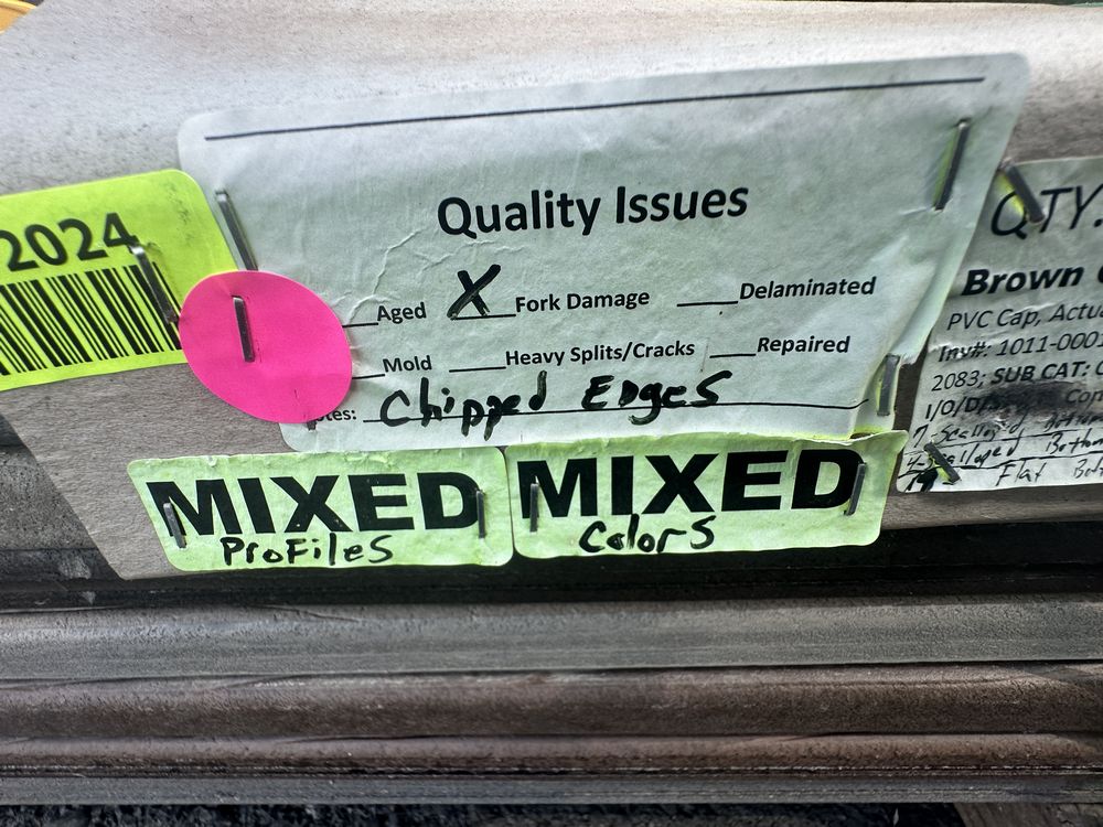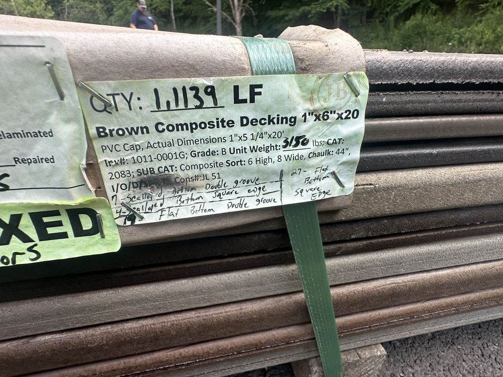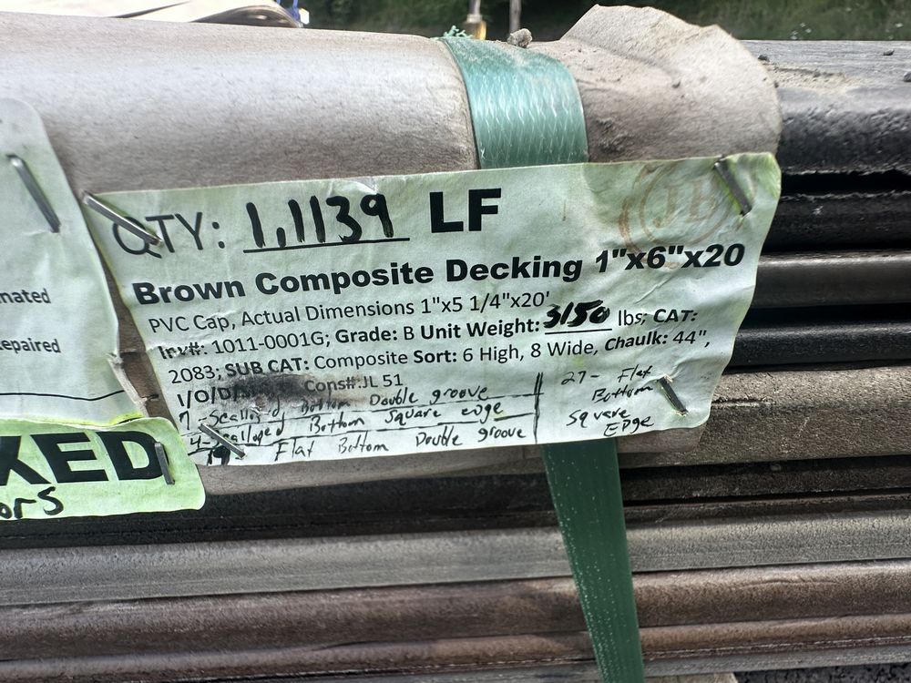 Brown Composite Decking 1"x6"x20' (Mixed Colors and Profiles) *See Description*. PVC Cap, Actual Dimensions 1"x5 1/4"x20', 68 Boards, 27 Flat Bottom Square Edge, 7 Scalloped Bottom Double Groove, 4 Scalloped Bottom Square Edge, 19 Flat Bottom Double Grooved, Grade: B *Fork Damage and Chipped Edge*,This is a liquidated product. The Auction Company makes no express or implied representations or warranties of any kind regarding the Product. Any pre-existing retail, wholesale or manufacturer warranties will not transfer with the sale of this Product unless expressly stated otherwise on this page. The Buyer accepts the Product in as-is condition, with all faults. Weight: 3150. Sold by: Linear Foot. Sold as: Quantity X Price. Inventory #: 1011-0001G