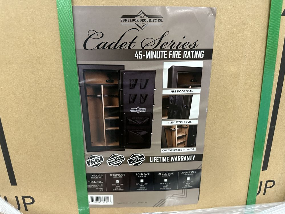 Surelock Gun Safe 59"x18"x18". By Surelock Security, Fits 12 Guns, 14-Gauge Steel Digital Lock, Key Backup Power Outlet+USB Customizable Interior, 45 Minutes Fire Rating, 1.25" Steel Bolts, Grade A,This is a liquidated product. Any pre-existing retail, wholesale or manufacturer warranties will not transfer with the sale of this Product unless expressly stated otherwise. Weight: 272 lbs. Sold by: Piece. Sold as: Quantity X Price. Inventory #: 4849-SLSCA-12B