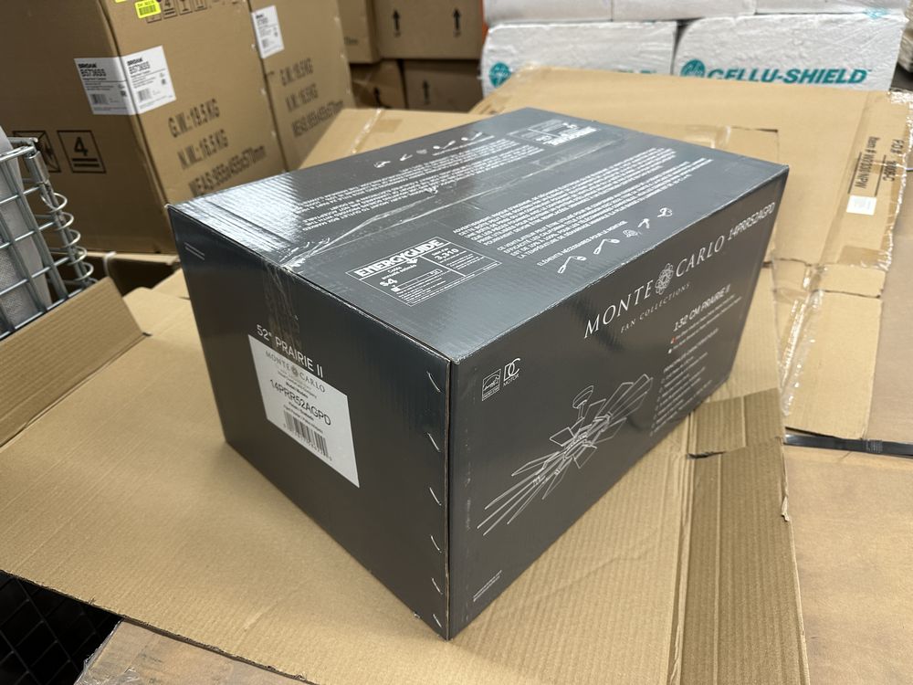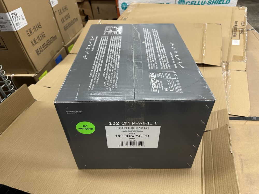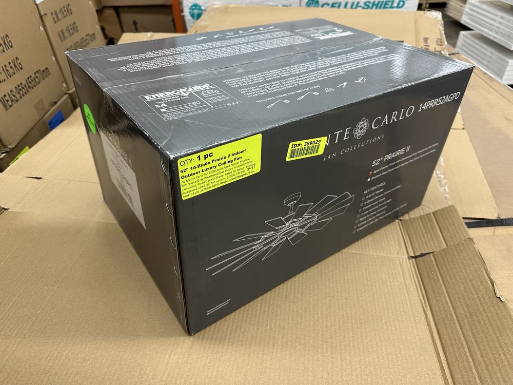 52" 14-Blade Prairie 2 Indoor/Outdoor Luxury Ceiling Fan MSRP: $1199. By Monte Carlo Fan Collections, Aged Pewter Finish W/Distressed Grey Weathered Oak Blades, 6-Speed Remote Controled, Frosted Lexan Shade, Rated For Damp Locations, Integrated 15w LED, 740 Lumens, 2,700K, CRI 90+ Grade: A,This is a liquidated product. Any pre-existing retail, wholesale or manufacturer warranties will not transfer with the sale of this Product unless expressly stated otherwise. Weight: 29. Sold by: Piece. Sold as: Quantity X Price. Inventory #: 24102-14PRR52AGPD