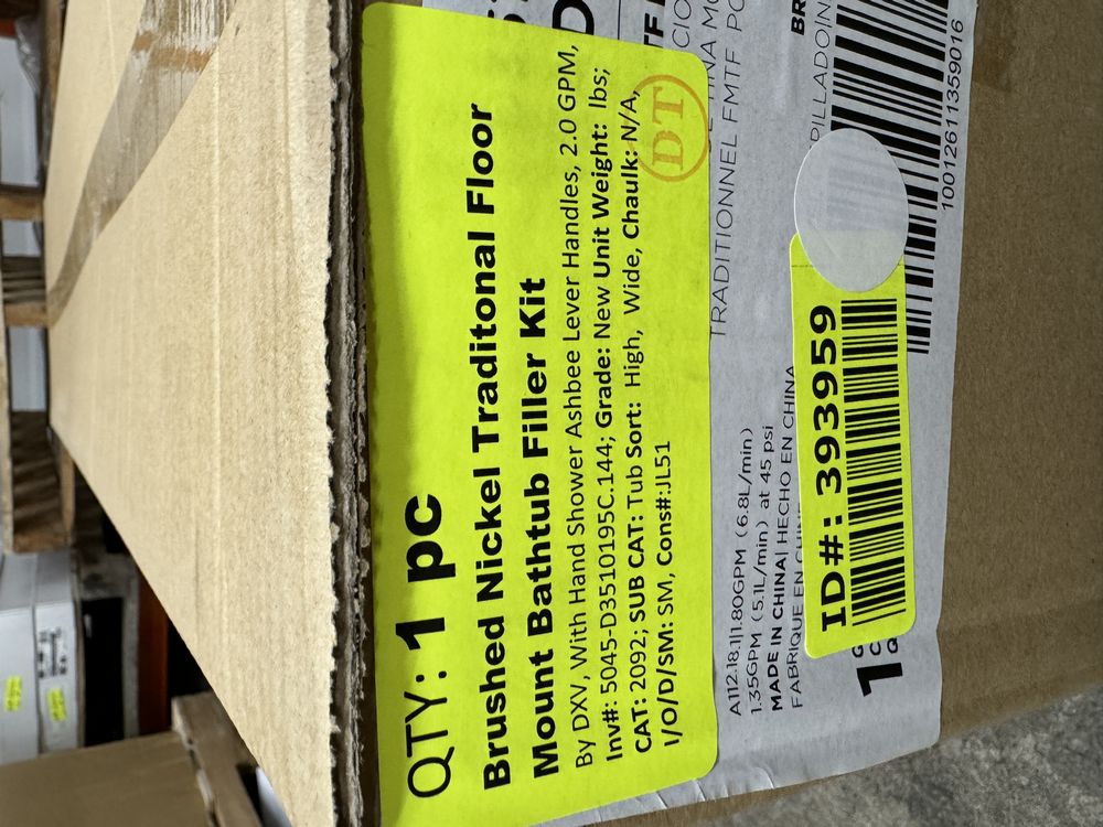 Brushed Nickel Traditional Floor Mount Bathtub Filler Kit MSRP: $2943. By DXV, With Hand Shower Ashbee Lever Handles, 2.0 GPM, Grade: New,This is a liquidated product. Any pre-existing retail, wholesale or manufacturer warranties will not transfer with the sale of this Product unless expressly stated otherwise. Weight: X. Sold by: Piece. Sold as: Quantity X Price. Inventory #: 5045-D3510195C.144