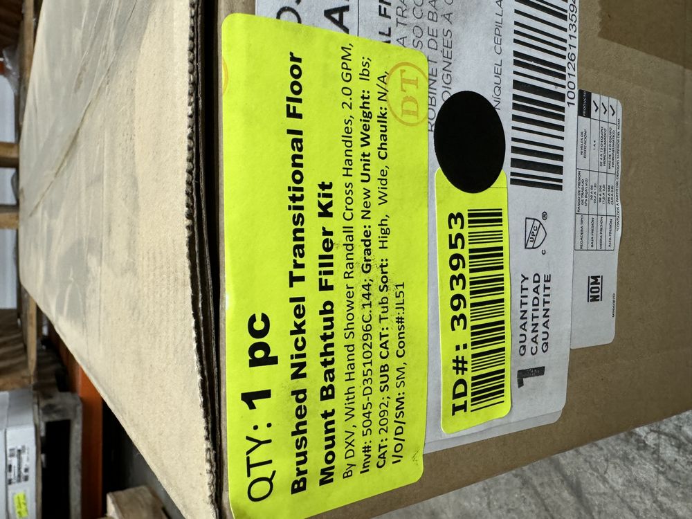 Brushed Nickel Transitional Floor Mount Bathtub Filler Kit MSRP: $2943. By DXV, With Hand Shower Randall Cross Handles, 2.0 GPM, Grade: New,This is a liquidated product. Any pre-existing retail, wholesale or manufacturer warranties will not transfer with the sale of this Product unless expressly stated otherwise. Weight: X. Sold by: Piece. Sold as: Quantity X Price. Inventory #: 5045-D3510296C.144