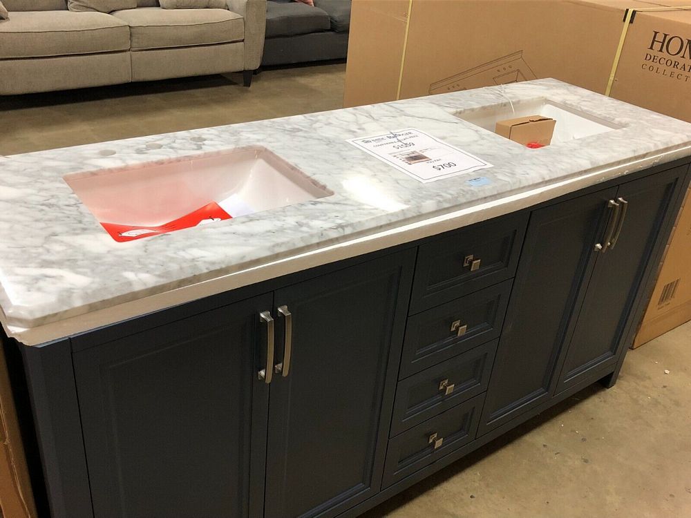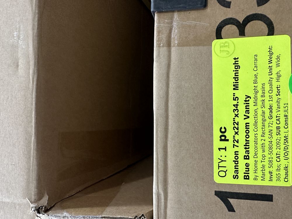 Sandon 72"x22"x34.5" Midnight Blue Bathroom Vanity. By Home Decorators Collection, Midnight Blue, Carrara Marble Top with 2 Rectangular Sink Basins, Grade: 1st Quality,This is a liquidated product. Any pre-existing retail, wholesale or manufacturer warranties will not transfer with the sale of this Product unless expressly stated otherwise. Weight: 350. Sold by: Piece. Sold as: Quantity X Price. Inventory #: 5081-50804-SAN 72