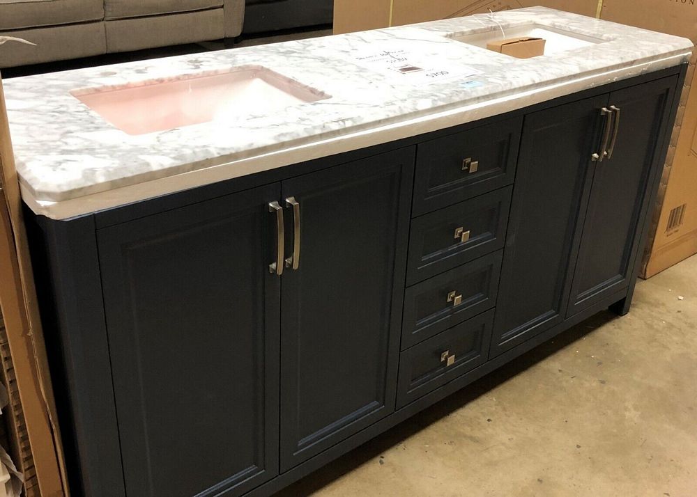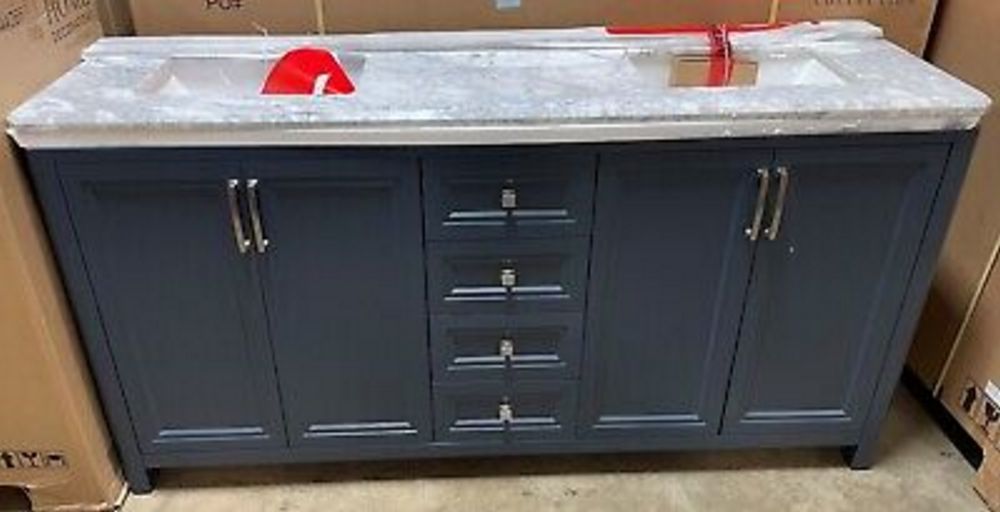 Sandon 72"x22"x34.5" Midnight Blue Bathroom Vanity. By Home Decorators Collections, Midnight Blue, Carrara Marble Top With 2 Rectangular Sink Basin, Grade:1 st Quality,This is a liquidated product. Any pre-existing retail, wholesale or manufacturer warranties will not transfer with the sale of this Product unless expressly stated otherwise. Weight: 365. Sold by: Piece. Sold as: Quantity X Price. Inventory #: 5081-50804-SAN 72