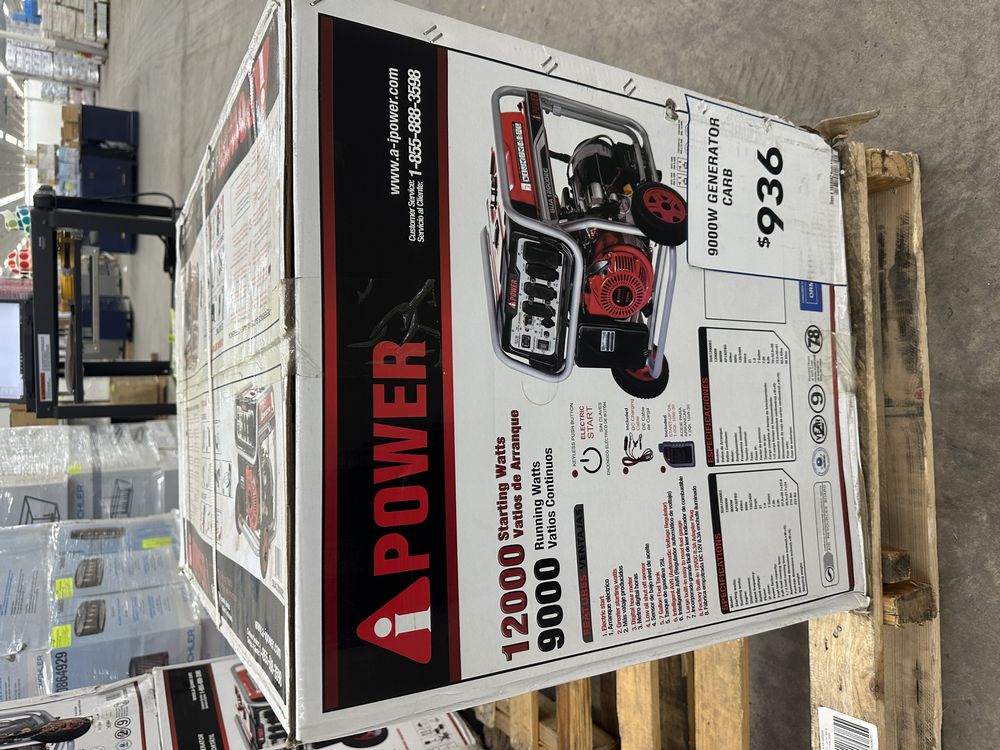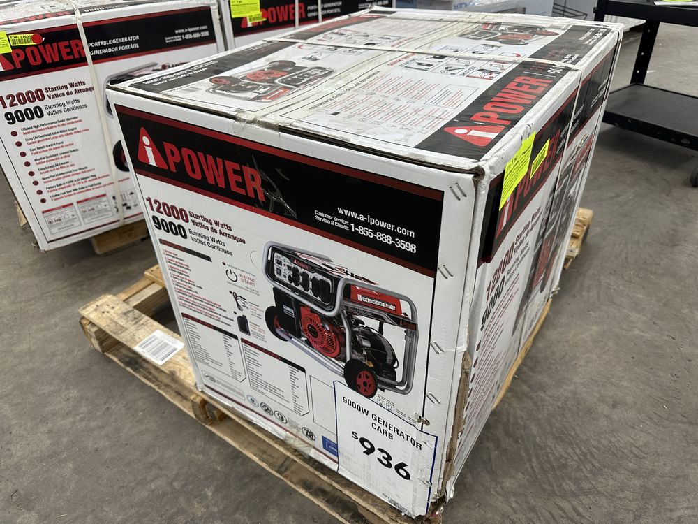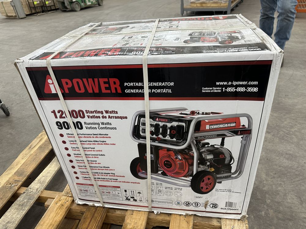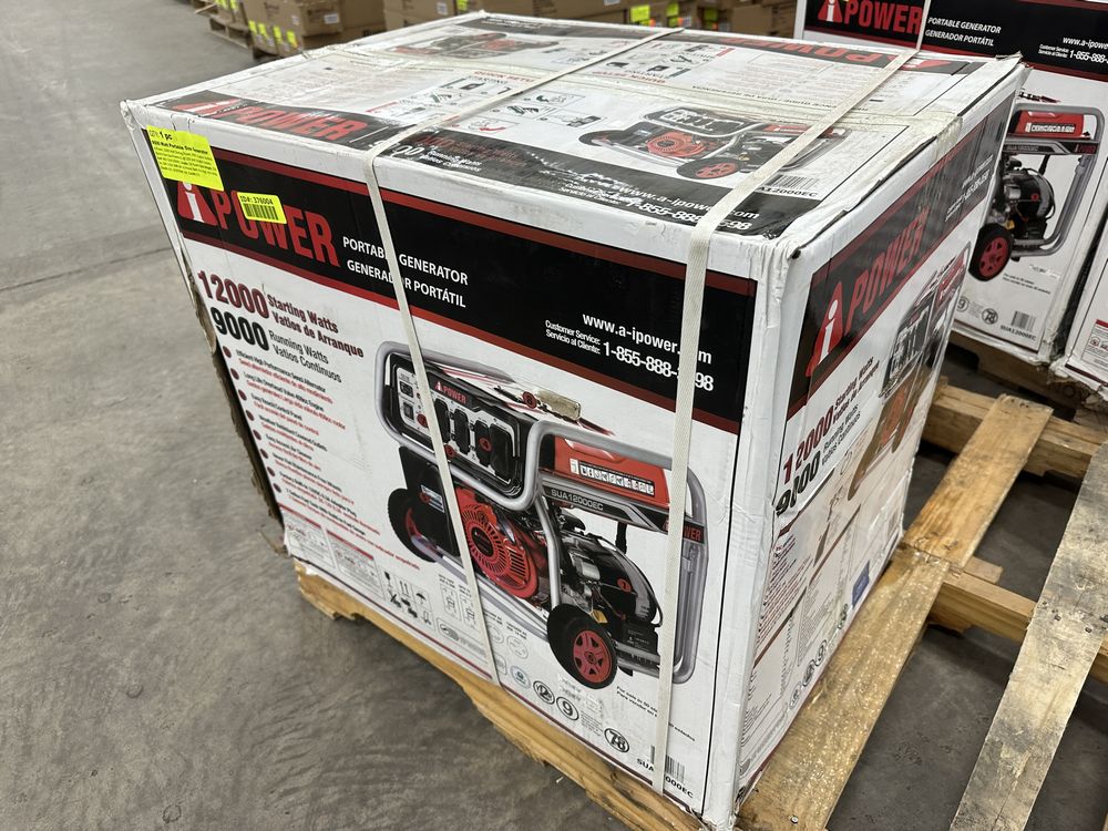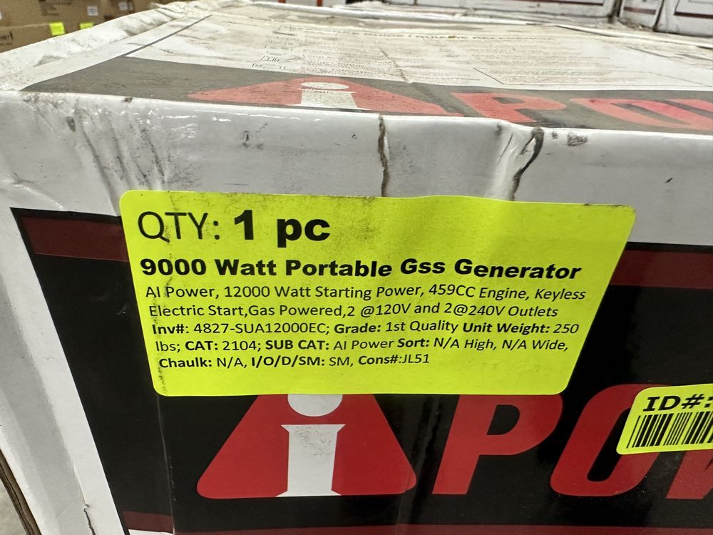 9000 Watt Portable Gas Generator. Al power, 12000 Watt Starting Power, 459CC Engine, Keyless Electric Start, Gas Powered, 2 @120V and 2@240V outlets. Grade: 1st Quality. This is a liquidated product. Any pre-existing retail, wholesale or manufacturer warranties will not transfer with the sale of this Product unless expressly stated otherwise. Weight: 250 lbs.. Sold by: Piece. Sold as: Quantity X Price. Inventory #: 4827-SUA12000EC