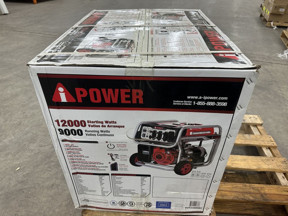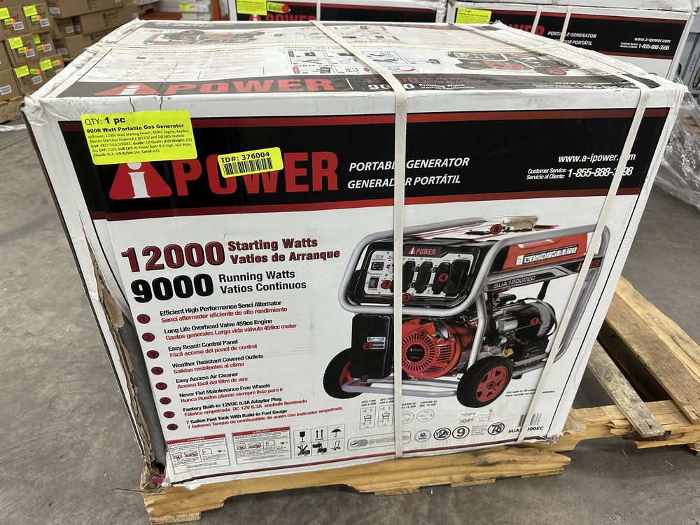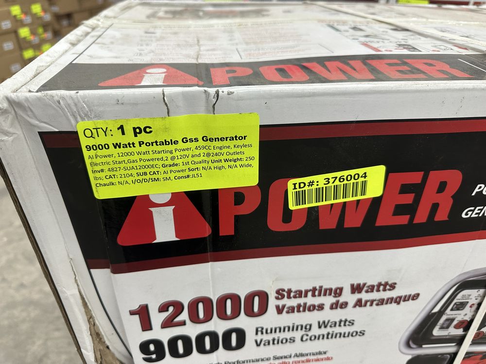 9000 Watt Portable Gas Generator. AI Power, 12000 Watt Starting Power, 459CC Engine, Keyless Electric Start, Gas Powered, 2 @120V and 2 @240V Outlets, Grade: 1st Quality,This is a liquidated product. Any pre-existing retail, wholesale or manufacturer warranties will not transfer with the sale of this Product unless expressly stated otherwise. Weight: 250. Sold by: Piece. Sold as: Quantity X Price. Inventory #: 4827-SUA12000EC