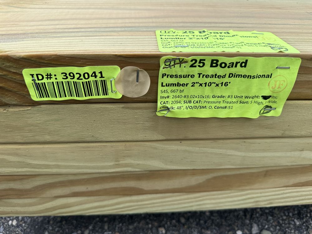 Pressure Treated Dimensional Lumber 2"x10"x16' **SEE DESCRIPTION**. S4S, 667 Board Foot Grade: #3 **Fork Damage, Heavy Splits/Cracks**,This is a liquidated product. The Auction Company makes no express or implied representations or warranties of any kind regarding the Product. Any pre-existing retail, wholesale or manufacturer warranties will not transfer with the sale of this Product unless expressly stated otherwise on this page. The Buyer accepts the Product in as-is condition, with all faults. Weight: x. Sold by: Board. Sold as: Quantity X Price. Inventory #: 2640-#3 02x10x16