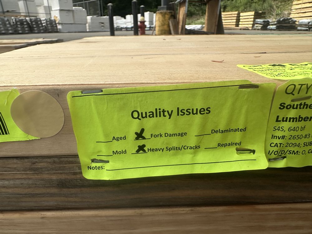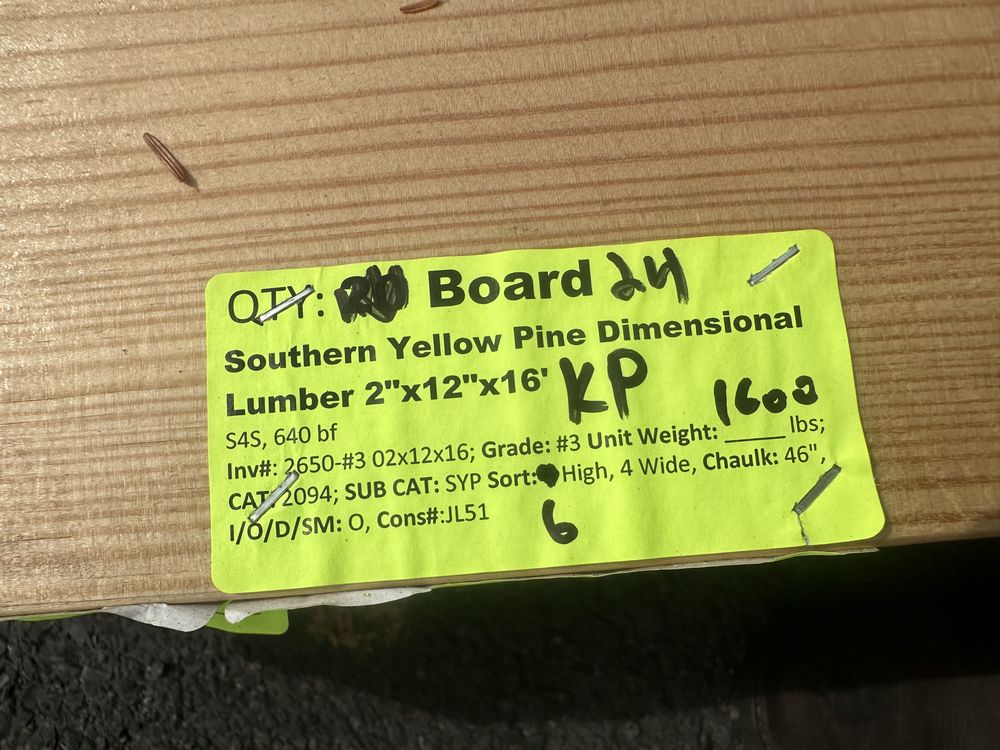 Southern Yellow Pine Dimensional Lumber 2"x12"x16' ** SEE DESCRIPTION**. S4S, 640 Board Foot, Grade: #3 **Fork Damage, Heavy Splits/Cracks, PLEASE SEE PHOTOS**,This is a liquidated product. The Auction Company makes no express or implied representations or warranties of any kind regarding the Product. Any pre-existing retail, wholesale or manufacturer warranties will not transfer with the sale of this Product unless expressly stated otherwise on this page. The Buyer accepts the Product in as-is condition, with all faults. Weight: 1600. Sold by: Board. Sold as: Quantity X Price. Inventory #: 2650-#3 02x12x16
