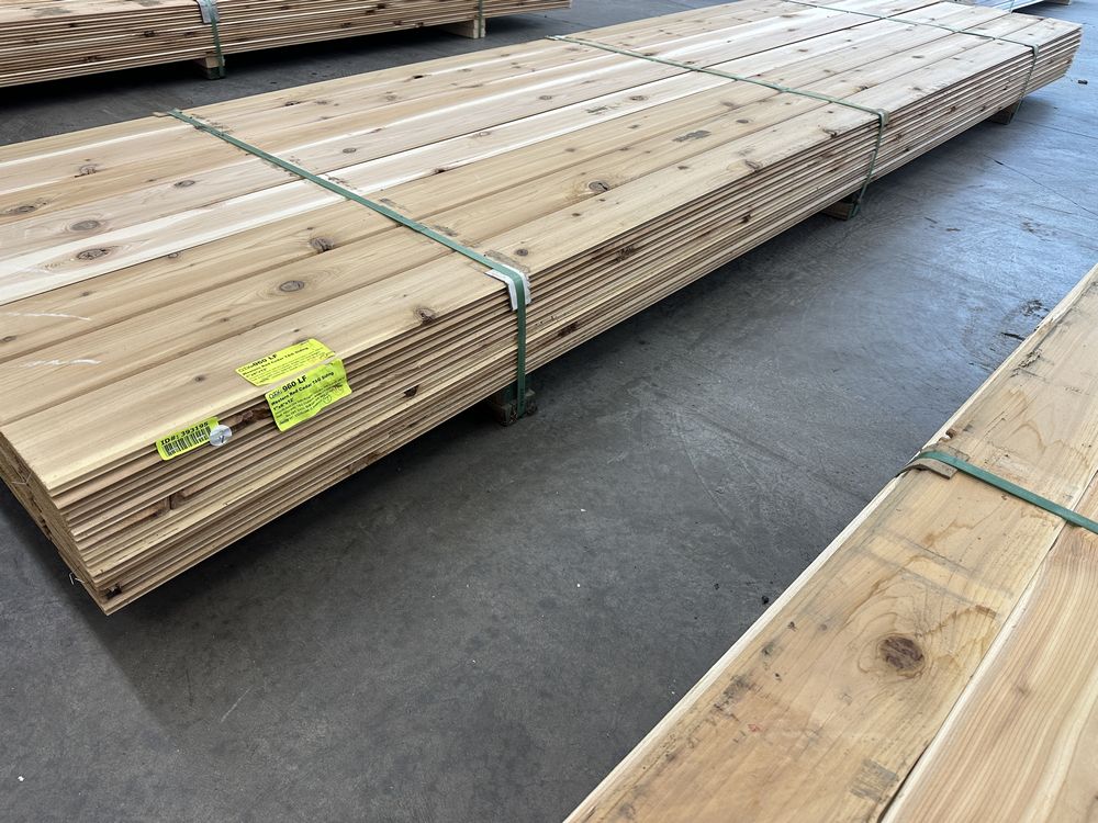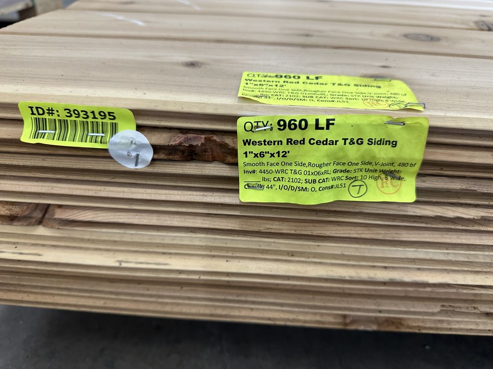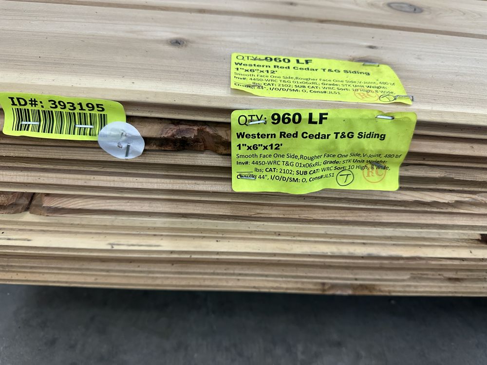 Western Red Cedar T&G Siding 1"x6"x12'. Smooth Face One Side, Rougher Face One Side, V-Joint, 480 Board Foot, Grade: STK,This is a liquidated product. The Auction Company makes no express or implied representations or warranties of any kind regarding the Product. Any pre-existing retail, wholesale or manufacturer warranties will not transfer with the sale of this Product unless expressly stated otherwise on this page. The Buyer accepts the Product in as-is condition, with all faults. Weight: x. Sold by: Linear Foot. Sold as: Quantity X Price. Inventory #: 4450-WRC T&G 01x06xRL