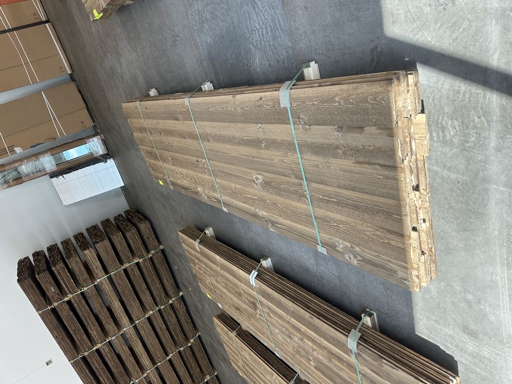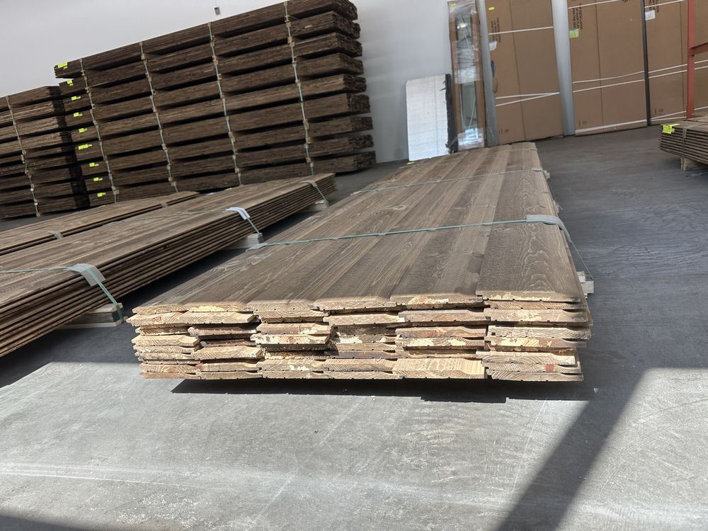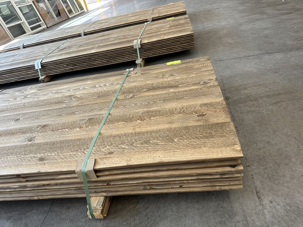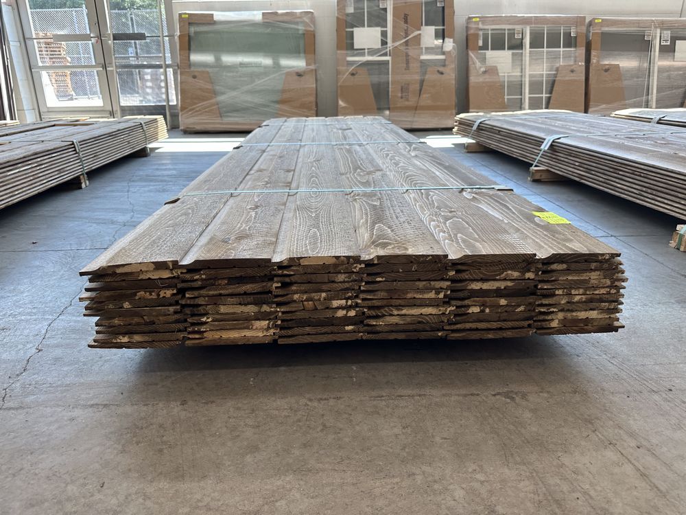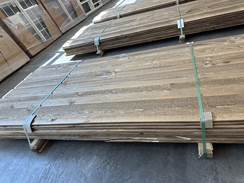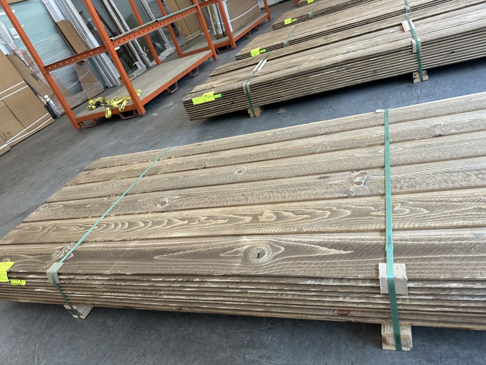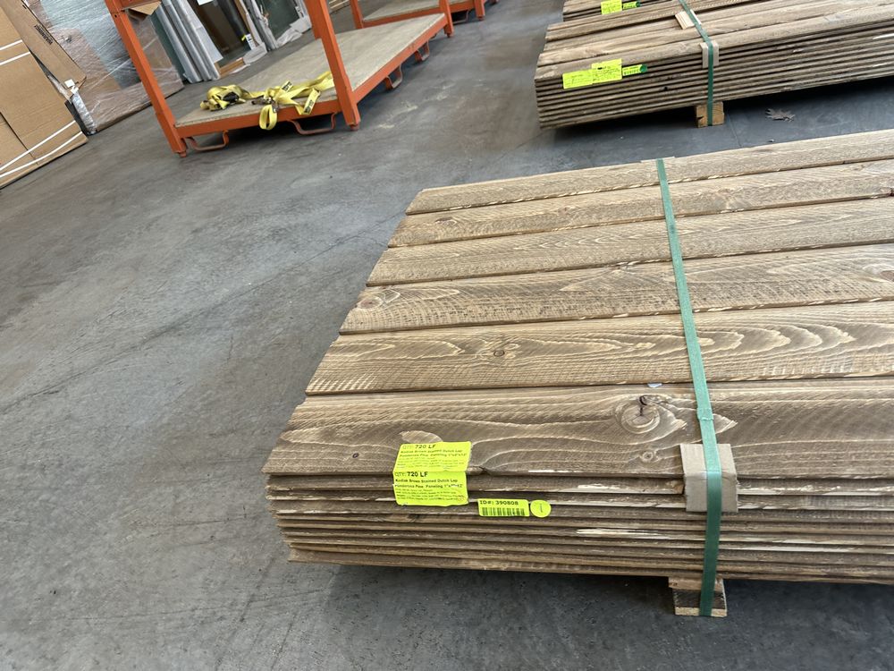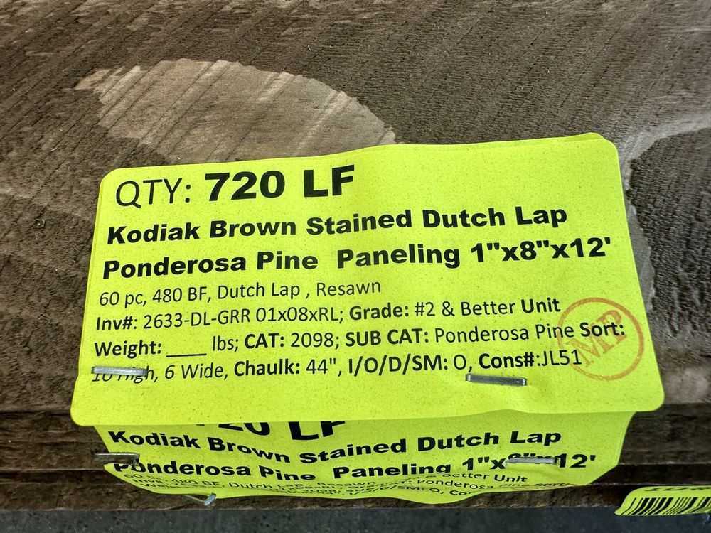 Kodiak Brown Stained Dutch Lap Ponderosa Pine Paneling 1"x8"x12'. 60 Pieces, 480 Board Feet, Dutch Lap, Resawn, Grade: #2 & Better,This is a liquidated product. The Auction Company makes no express or implied representations or warranties of any kind regarding the Product. Any pre-existing retail, wholesale or manufacturer warranties will not transfer with the sale of this Product unless expressly stated otherwise on this page. The Buyer accepts the Product in as-is condition, with all faults. Weight: X. Sold by: Linear Foot. Sold as: Quantity X Price. Inventory #: 2633-DL-GRR 01x08xRL